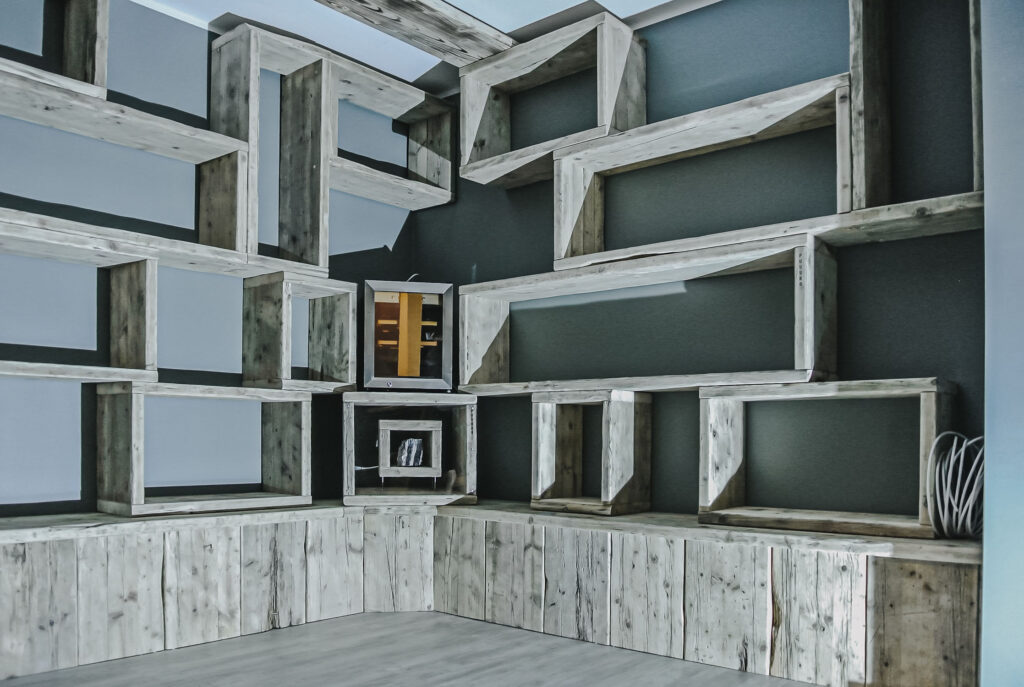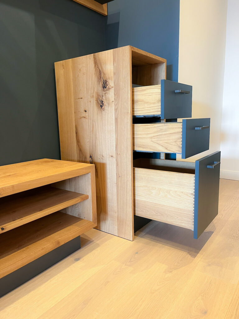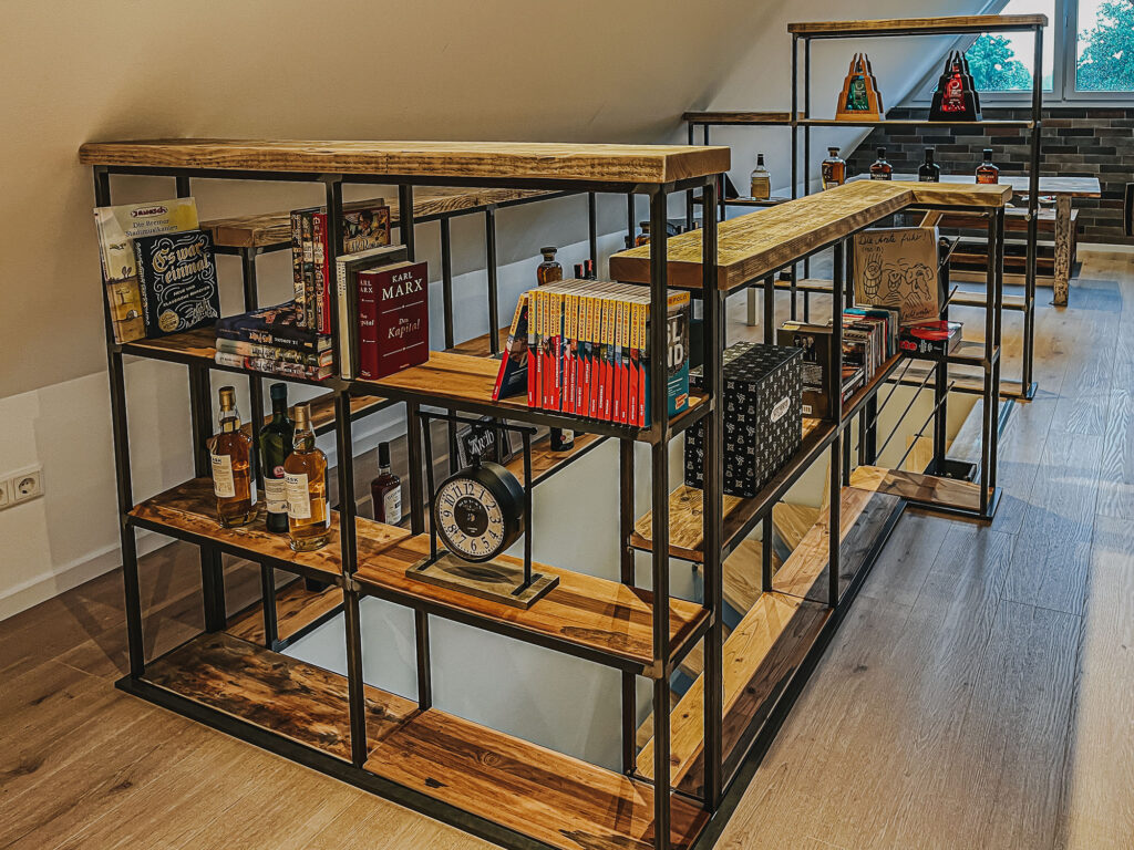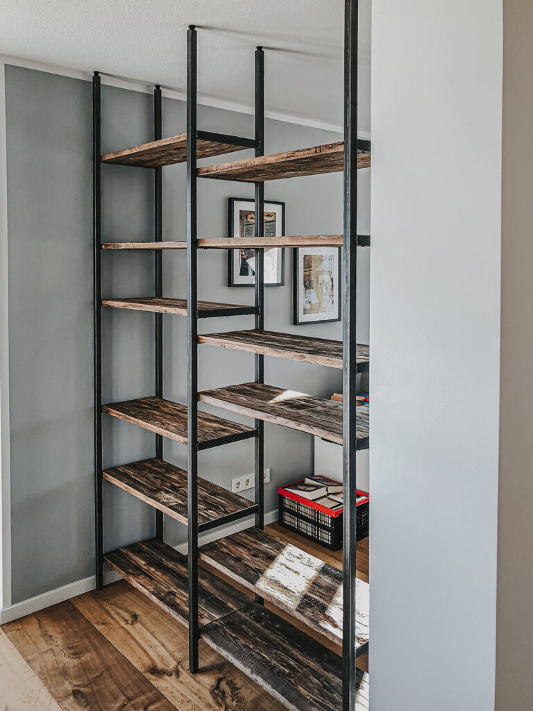 Mit Regalen und Schränken aus Holzbohle und Eiche gut organisiert.