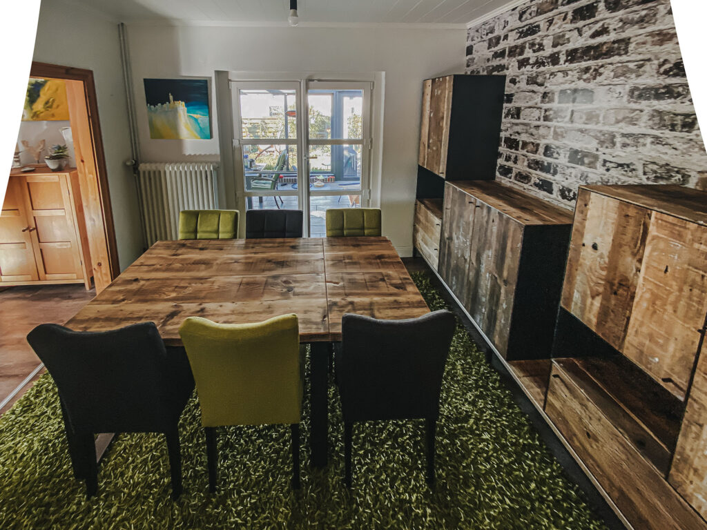 Ob 3 Meter Esstisch für die ganze Mannschaft oder komplettes Einrichtungskonzept – manchmal ist es gut zu schnacken und die Materialien zu erleben. Mit Kaffee natürlich, immer.