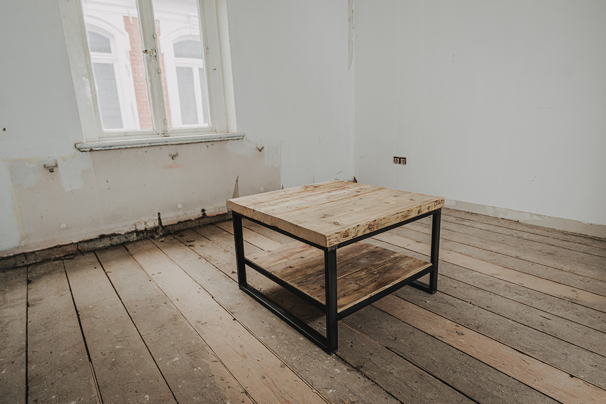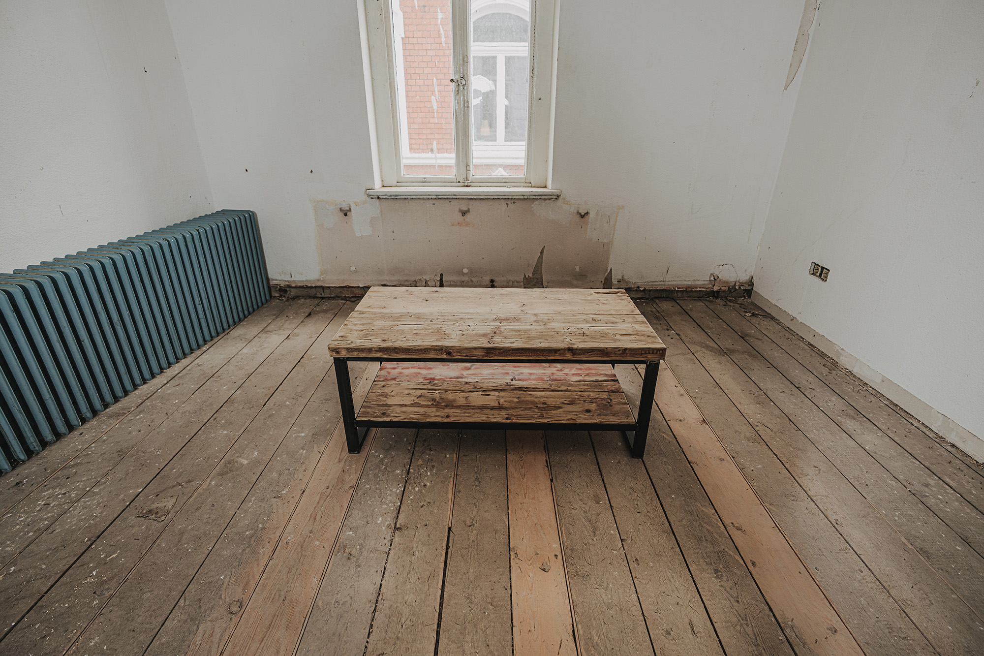 Die Möbel unserer Klassik-Serie werden aus recycelten Gerüstbohlen hergestellt, ohne Oberflächenschutz. Da es sich bei den Bohlen um Weichholz handelt, vornehmlich Fichte oder Tanne, reagieren sie auf Temperatur- und Feuchtigkeitsschwankungen. Dadurch können sich im Laufe der Zeit Maße und Oberflächen leicht verändern. Auch nach der Verarbeitung der Bohlen und der Herstellung der Möbel können Trocknungsrisse, Verwerfungen, Schwindungen oder Quellungen auftreten. Gelegentlich können sich Splitter, Äste oder ausgeschliffene Fehlstellen von der Oberfläche abheben oder lösen. Dies ist ein natürliches Verhalten von Holz und soll auch so sein. Unsere Möbel sollen lebendig bleiben.