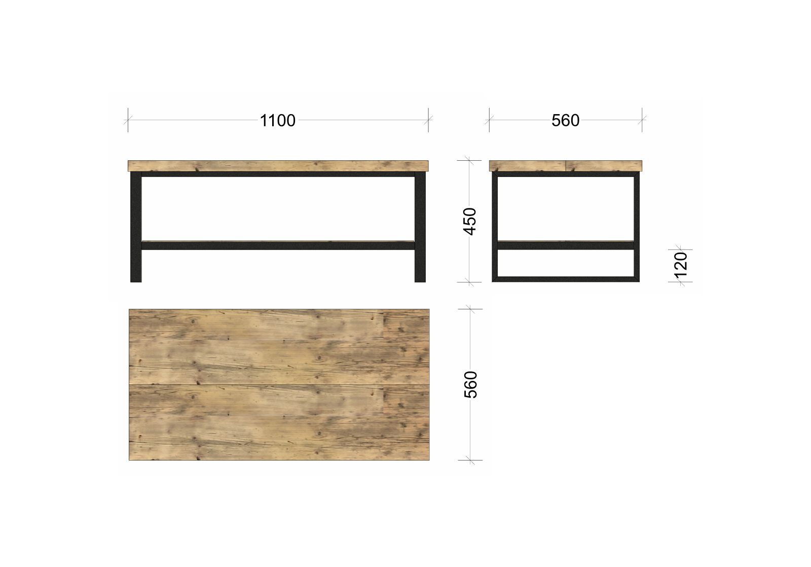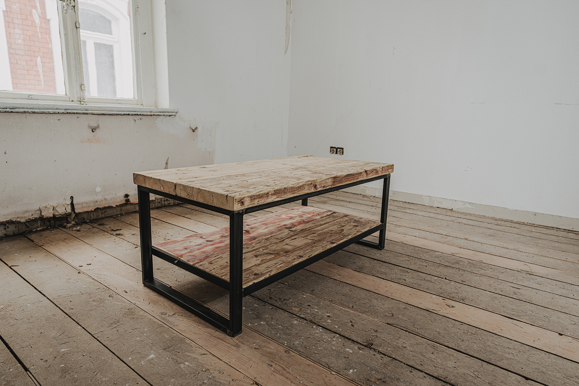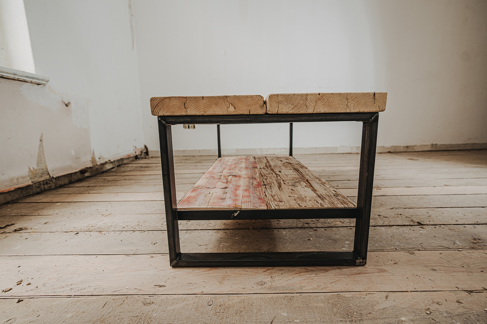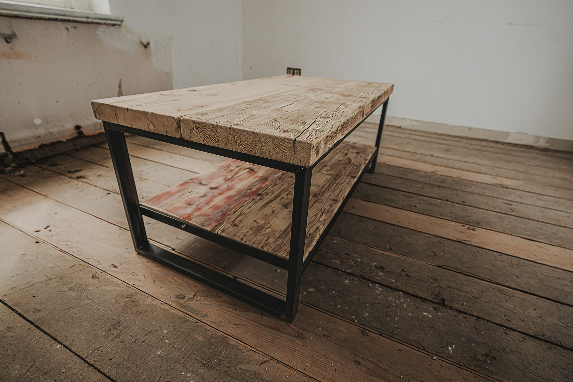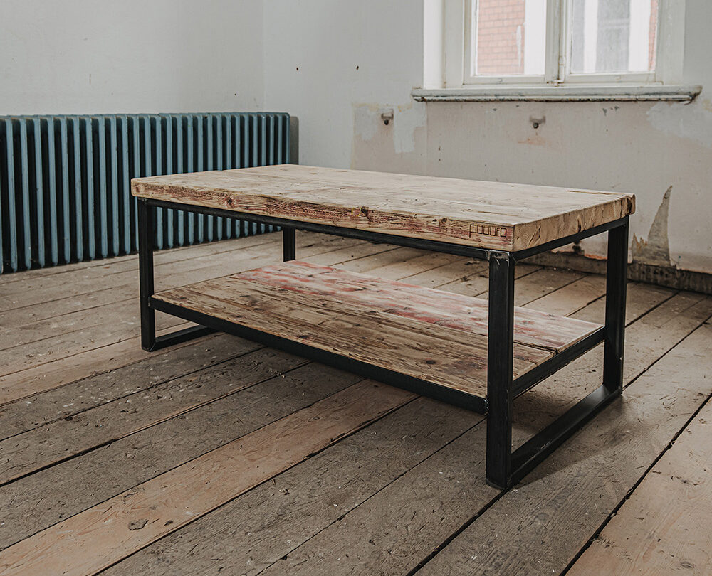 Couchtisch Swette mit Ablage, aus genutzten Bau-Gerüstbohlen und Schwarzstahlgestell gem. Abbildungen.