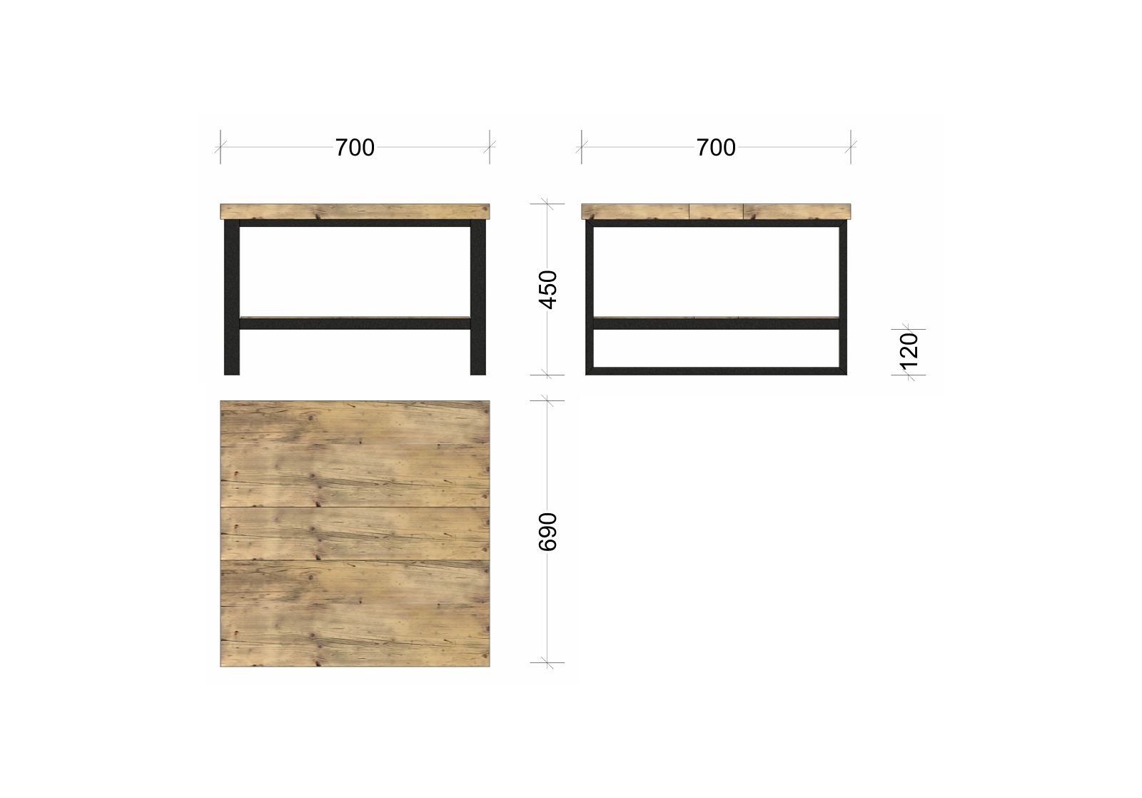 Tiefe ca. 70 cm (2 Bohlen in Originalbreite à ca. 28 cm und mittiges Passstück geschnitten)