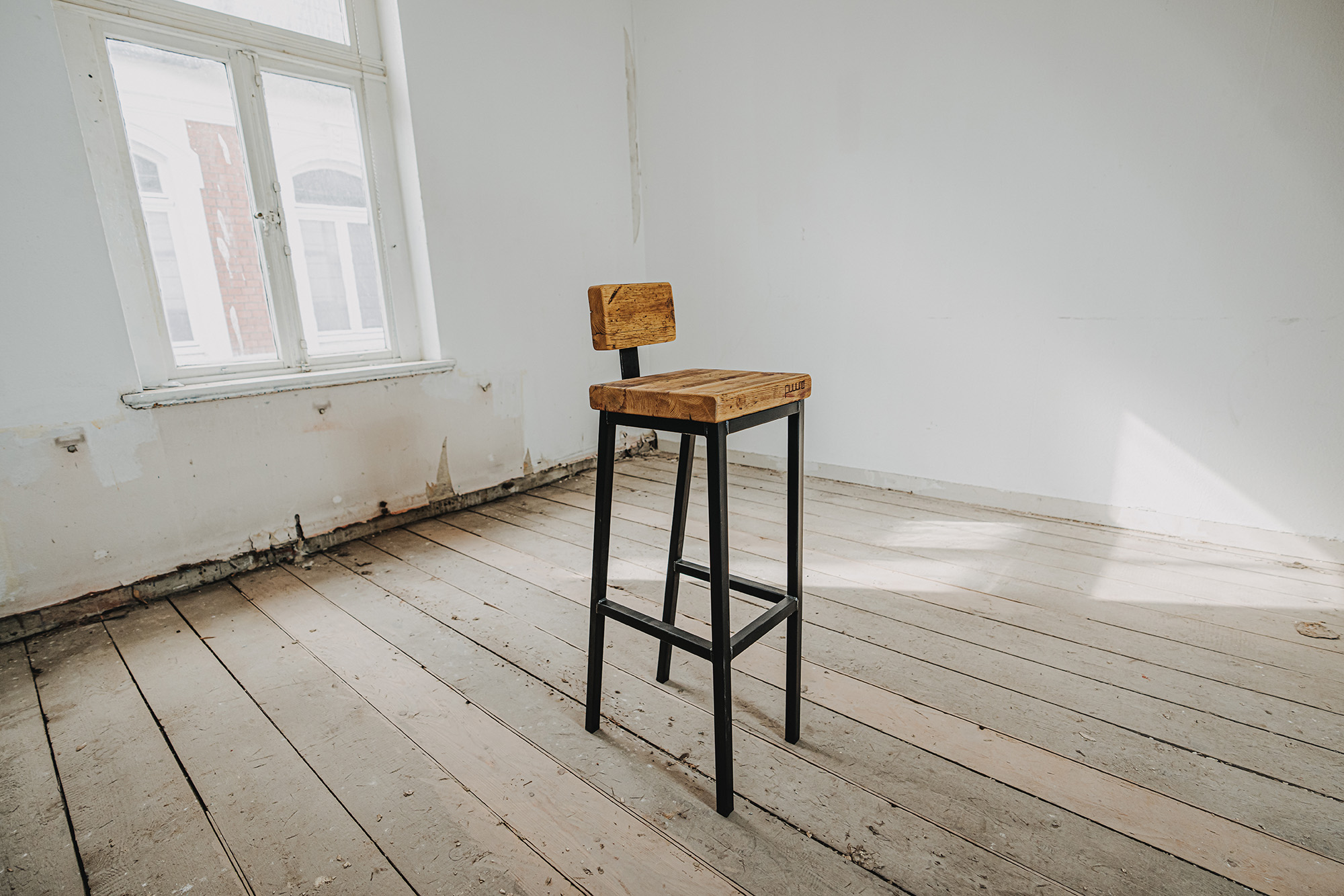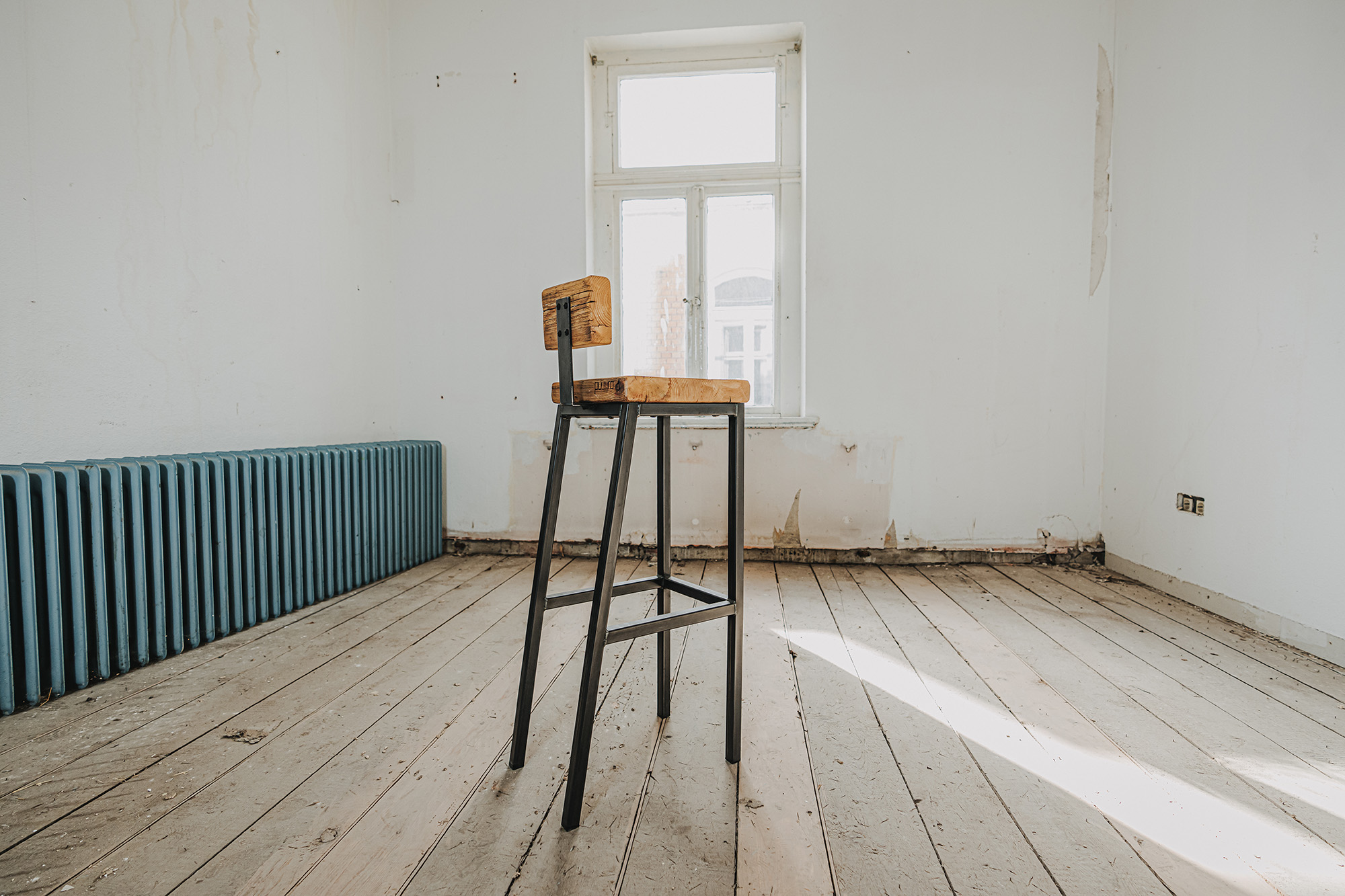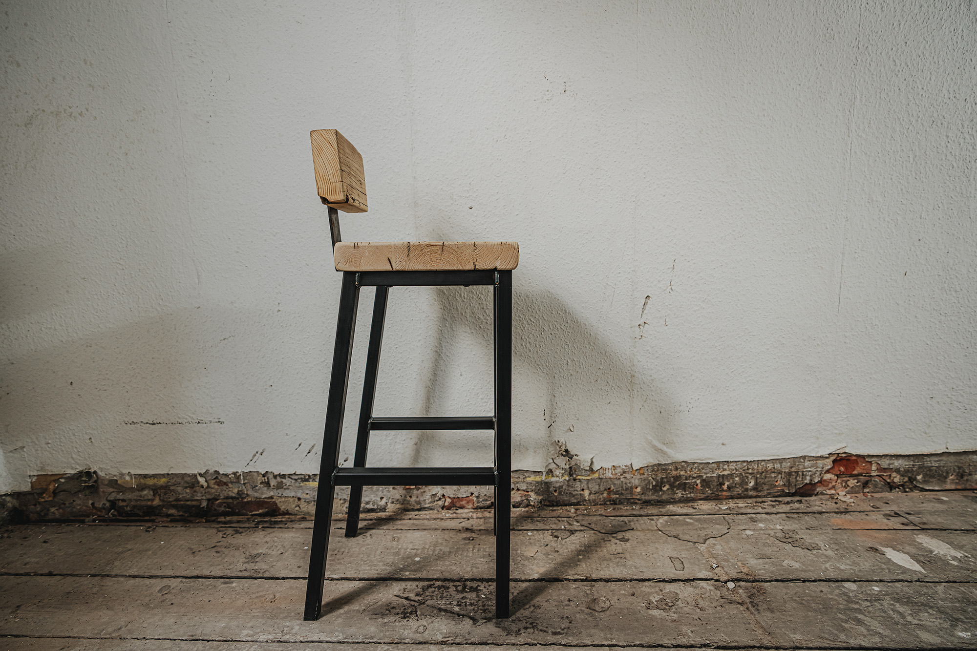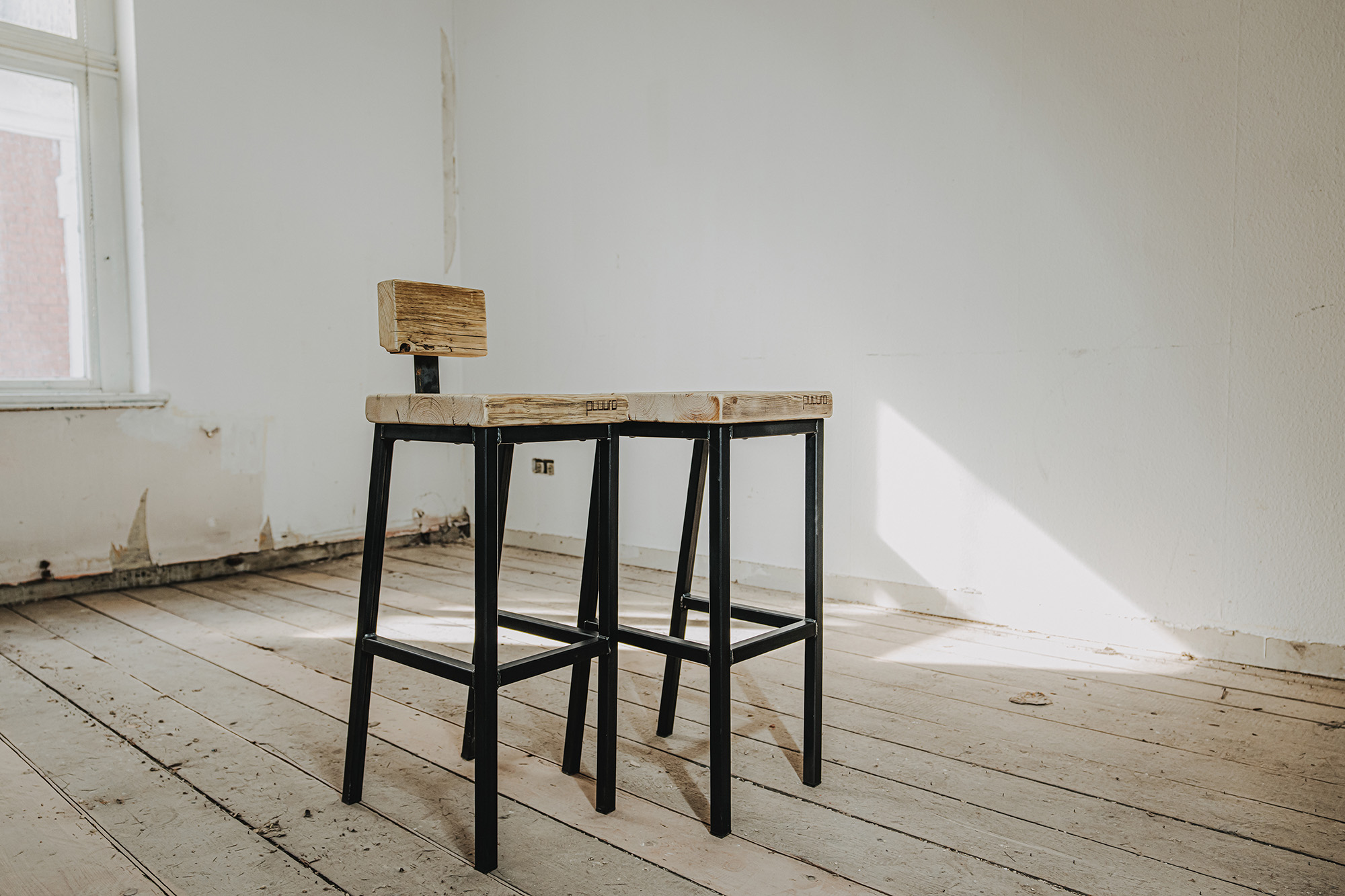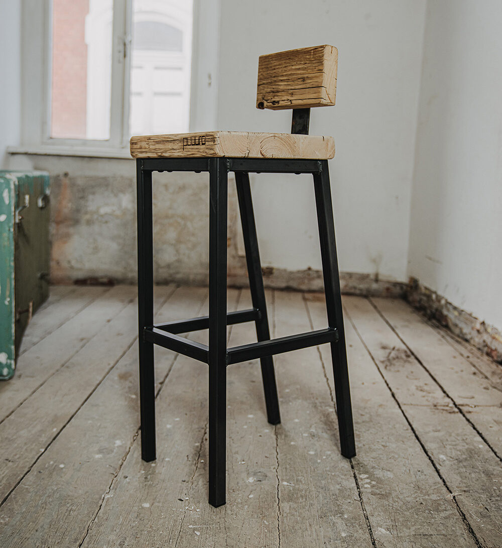 Wie wäre es, wenn du auf unserem Barhocker Platz nimmst? Der Hocker besteht aus einem massiven Gestell aus Schwarzstahl und einer Sitzfläche aus echten Gerüstbohlen. Du hast die Wahl, ob du eine kleine Lendenstütze haben möchtest oder nicht - wir bieten beides an!