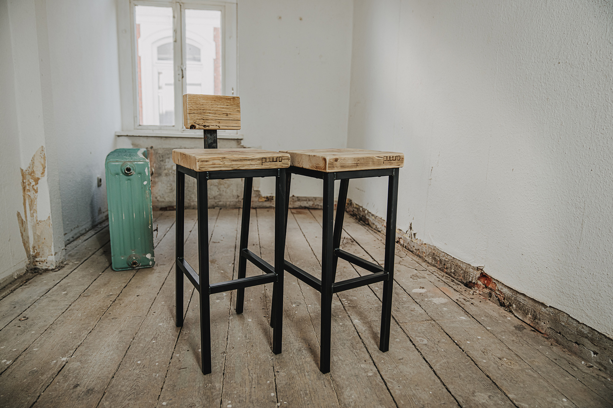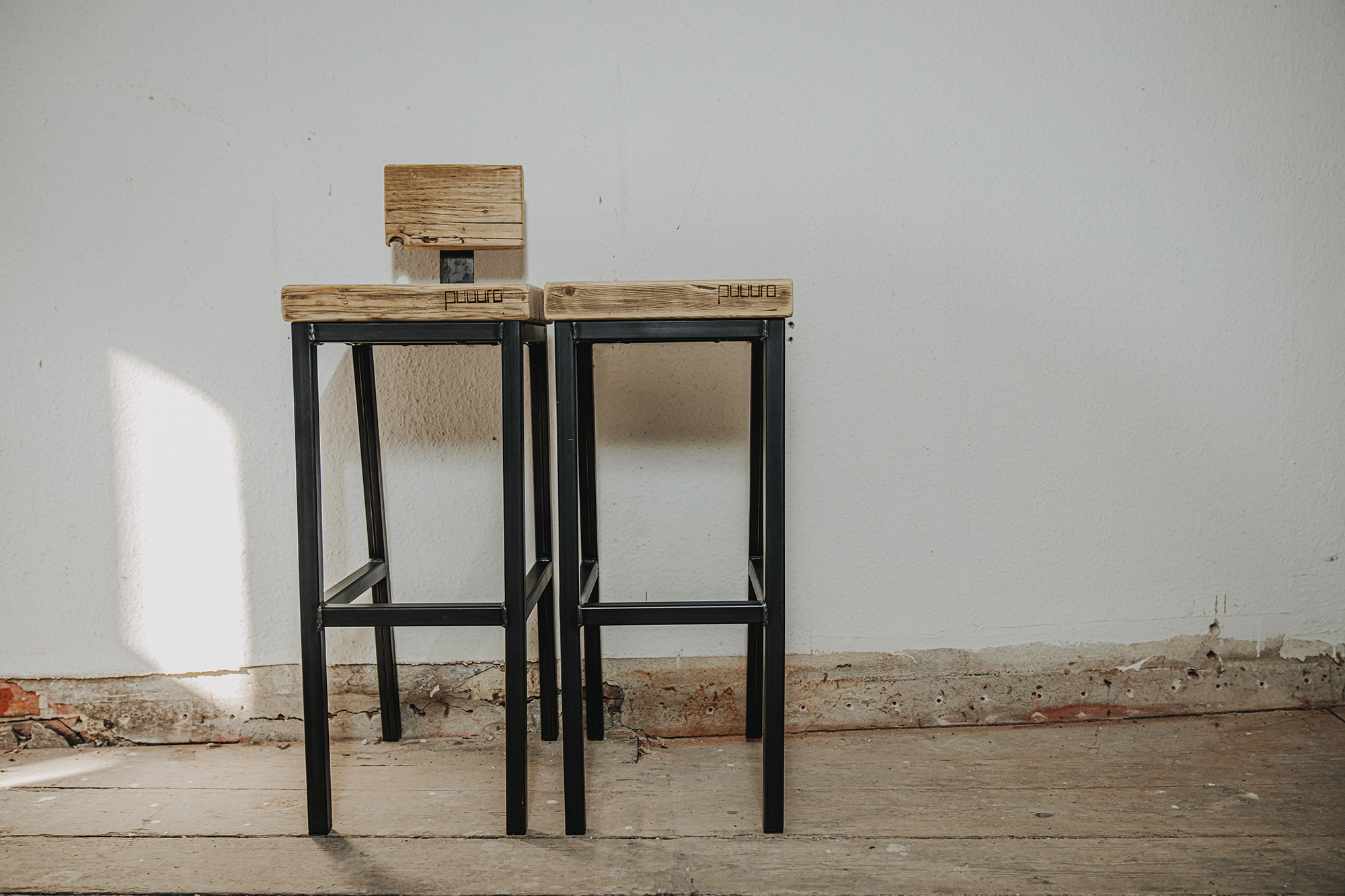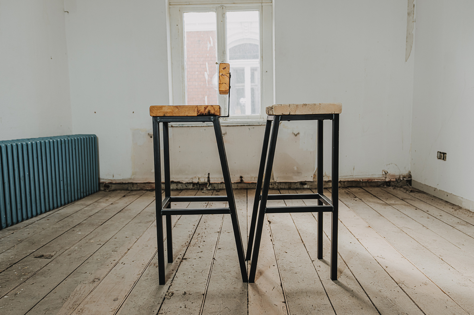 Hochhocker RAIMA in zwei Sitzhöhen, mit und ohne Lendenstütze aus Schwarzstahl mit Sitzfläche/Stütze aus genutzten Bau-Gerüstbohlen gem. Abbildungen.