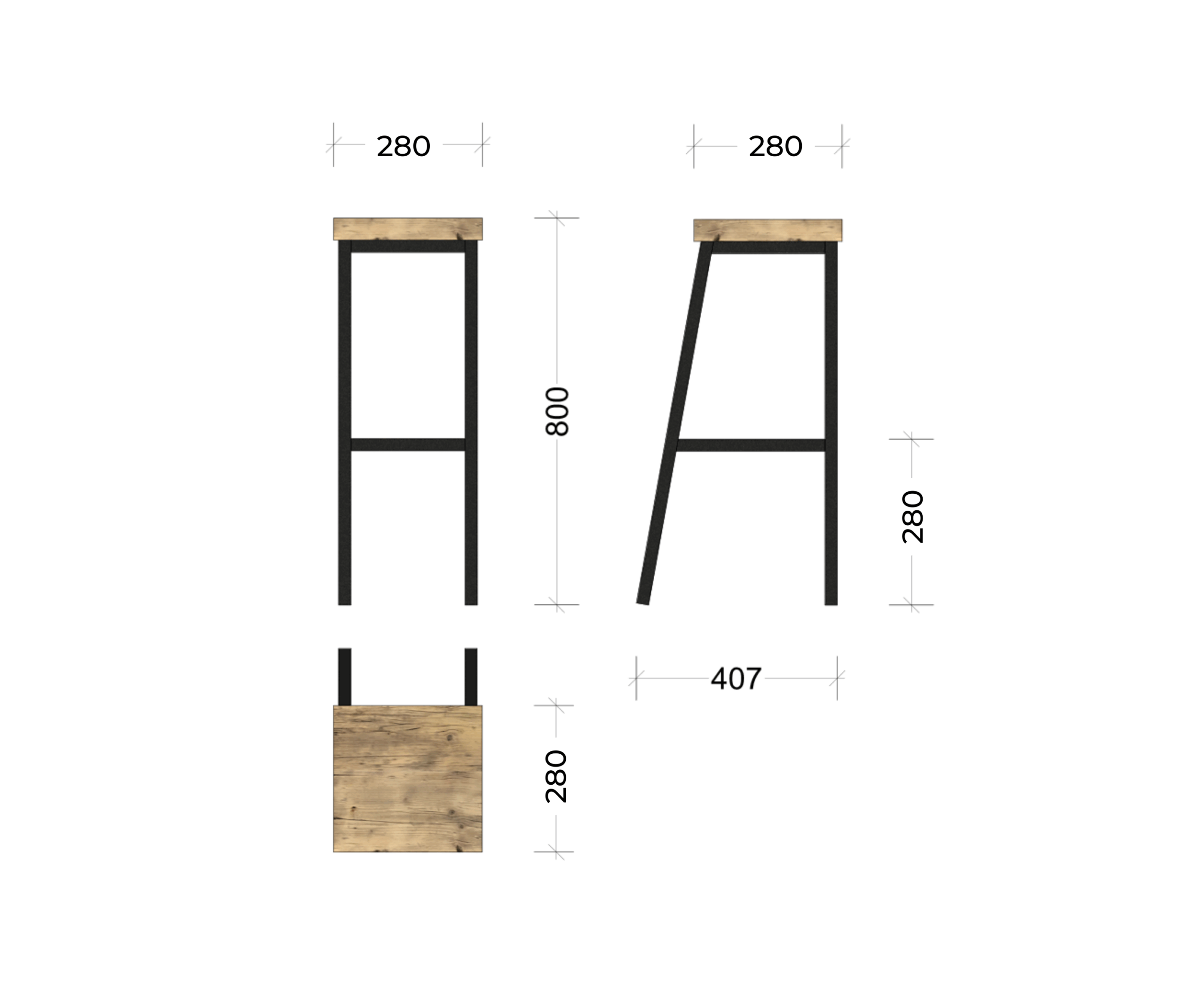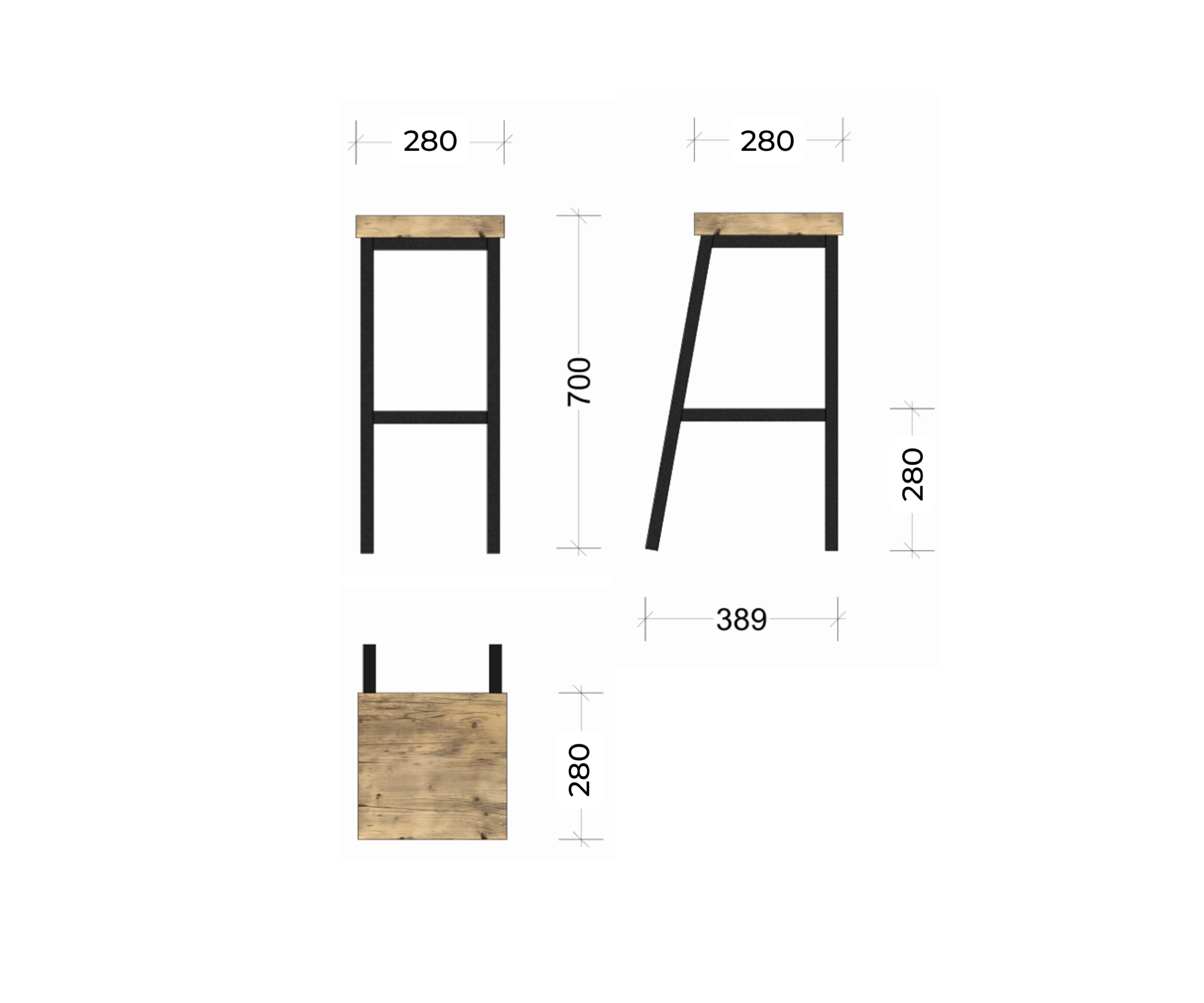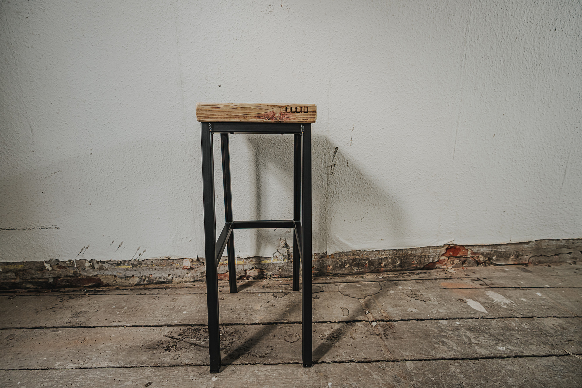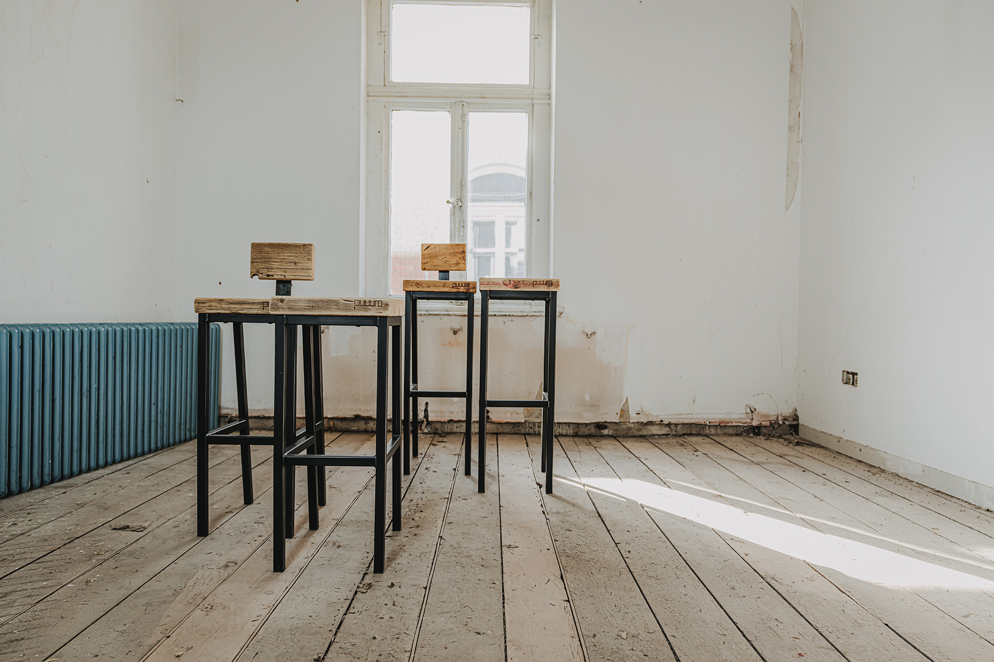 Hochhocker RAIMA in zwei Sitzhöhen, mit und ohne Lendenstütze aus Schwarzstahl mit Sitzfläche/Stütze aus genutzten Bau-Gerüstbohlen gem. Abbildungen.