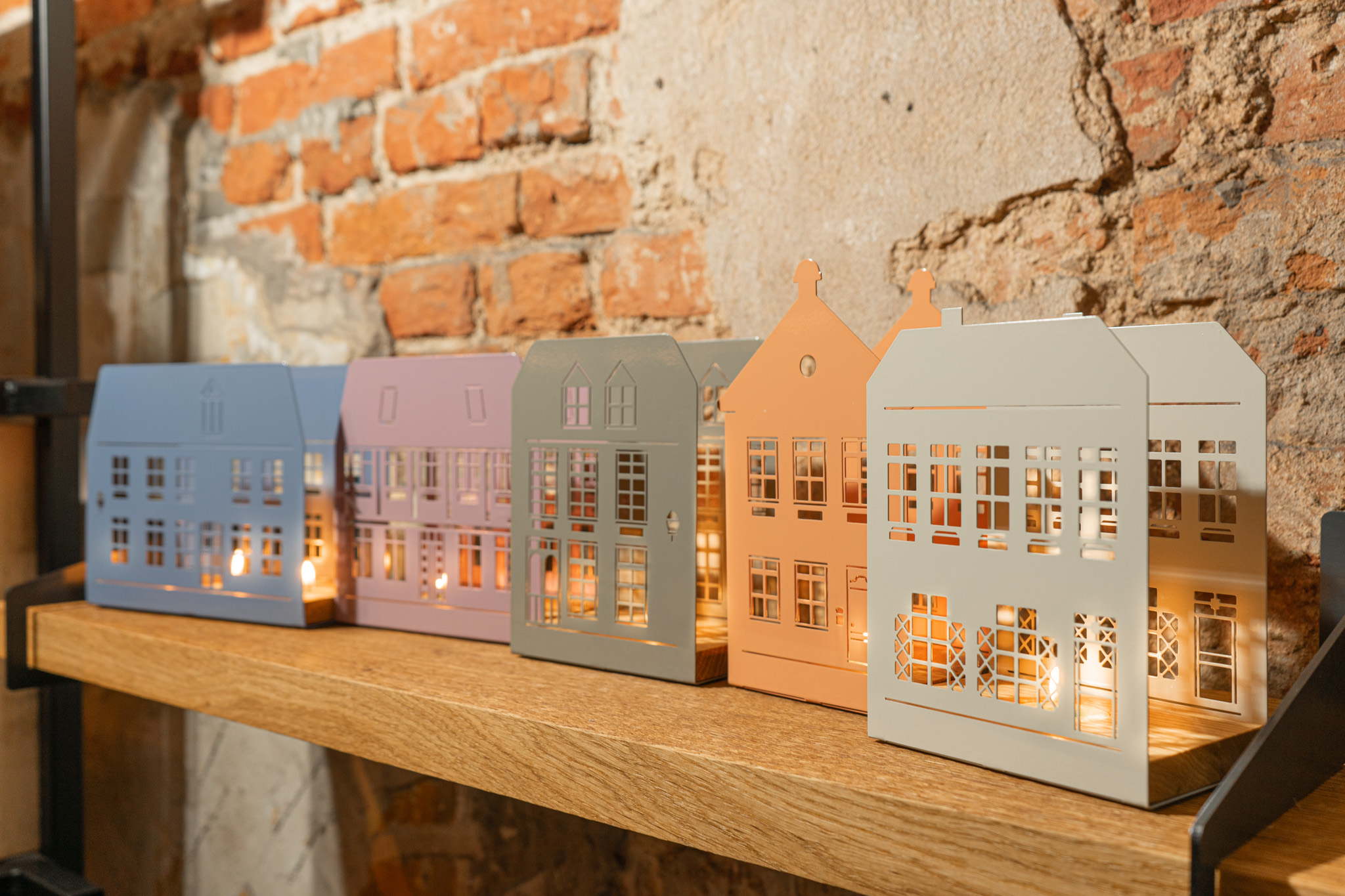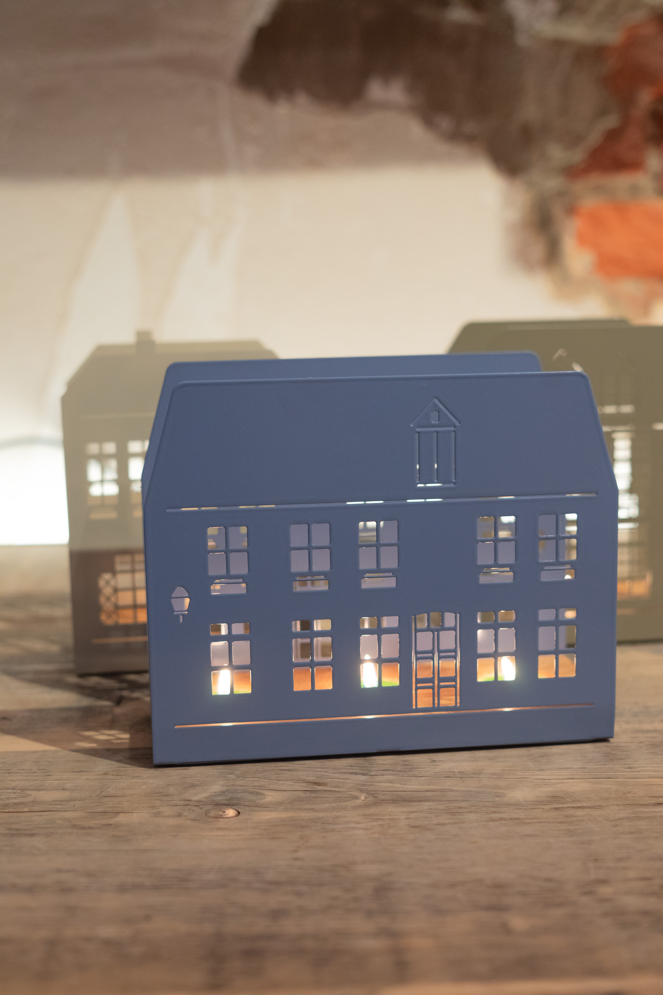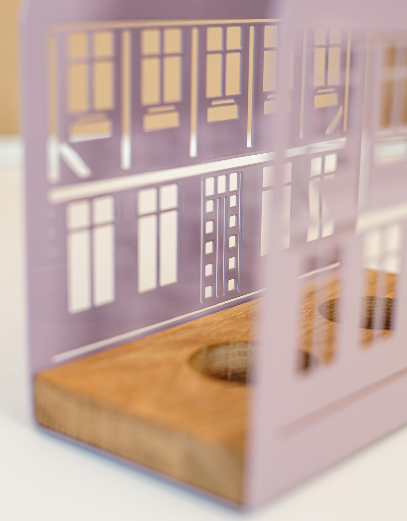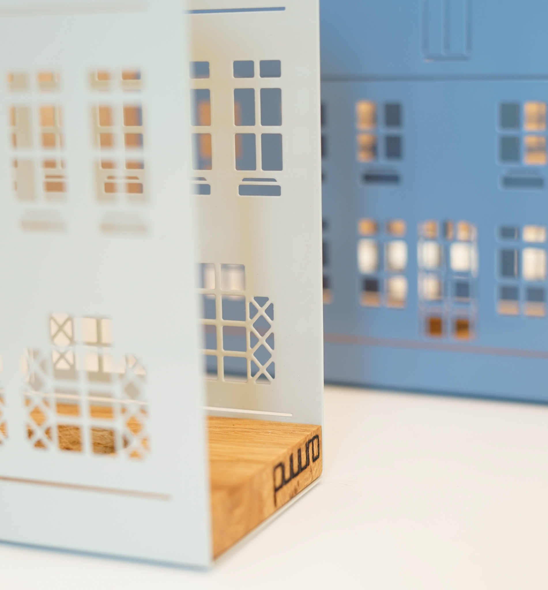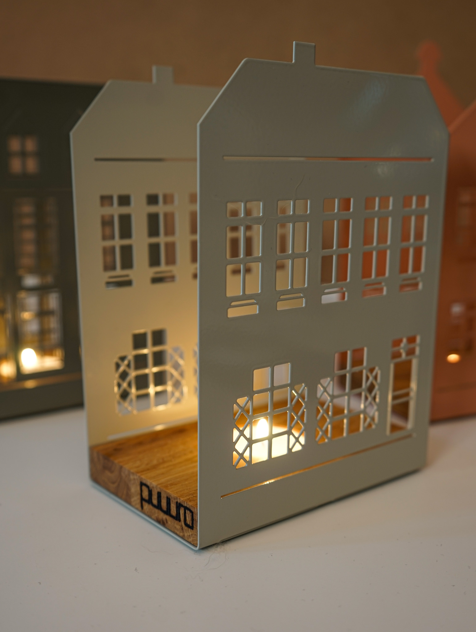 Sie bestehen aus pulverbeschichtetem Stahl und Wildeiche. Je nach Häuschen kannst du 1-3 Teelichter pro Haus unterbringen.