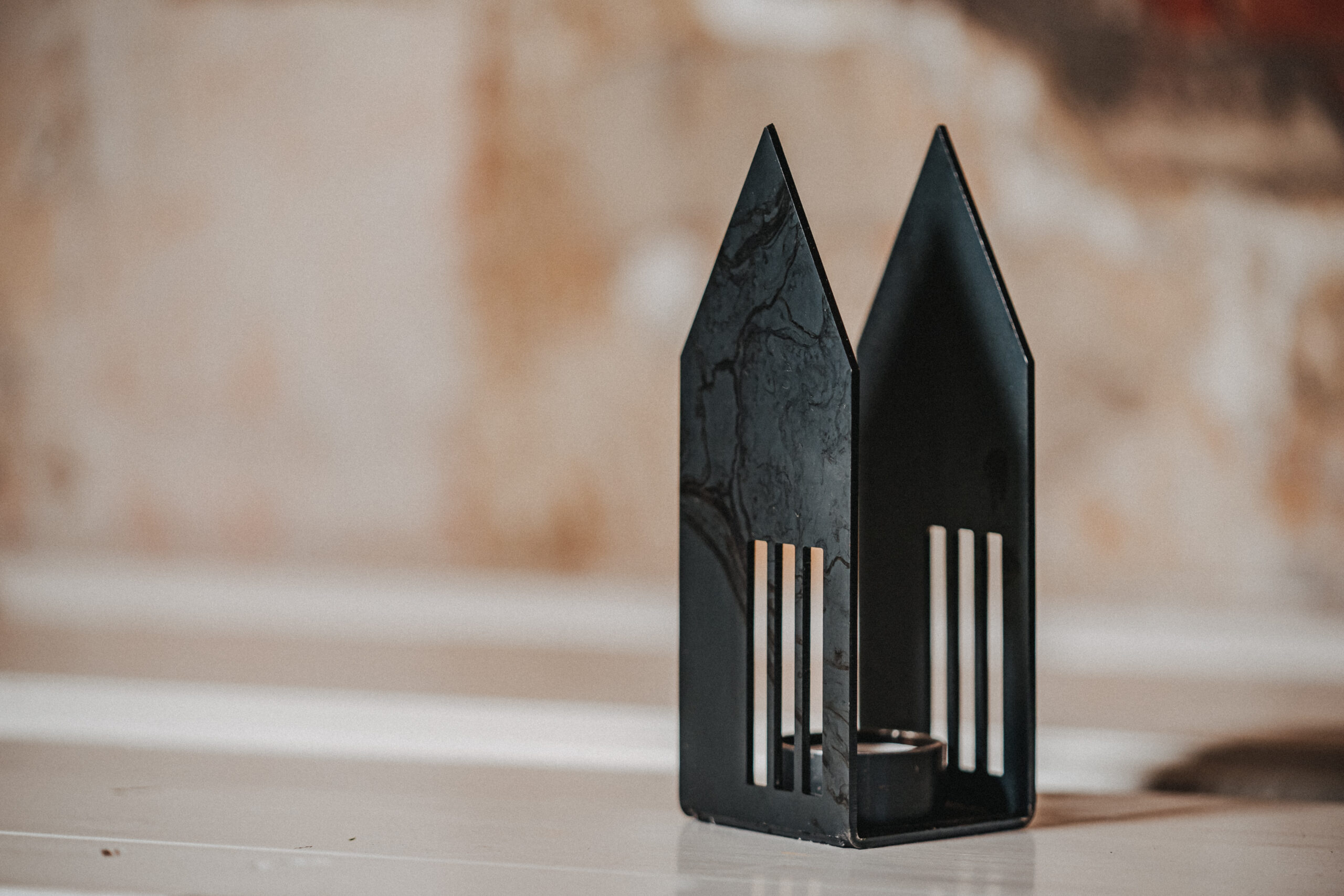 Durch die schmalen Stahlstreben scheint der warme Ton eines Teelichtes.