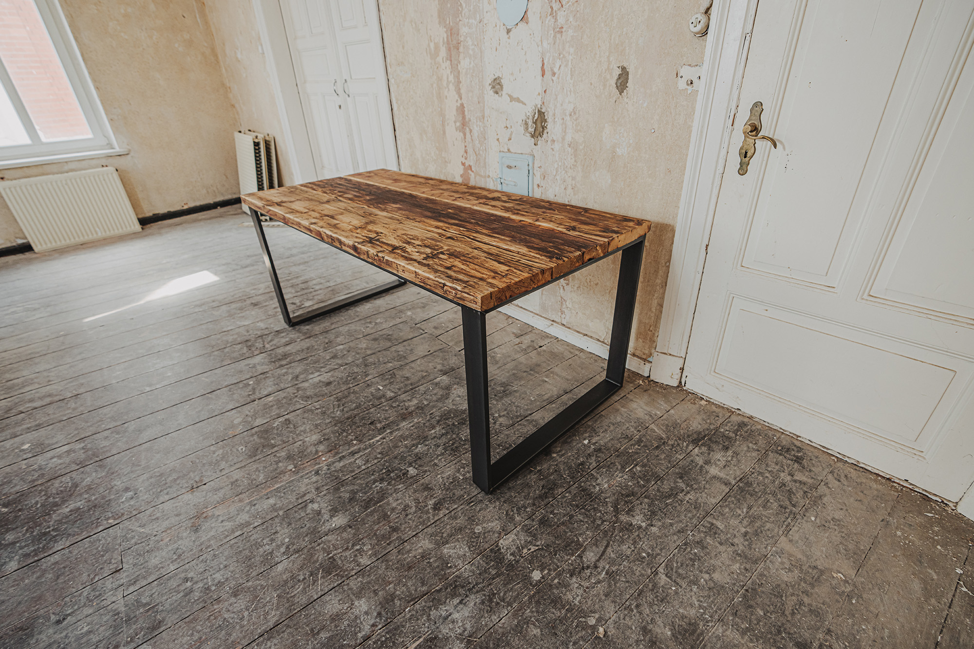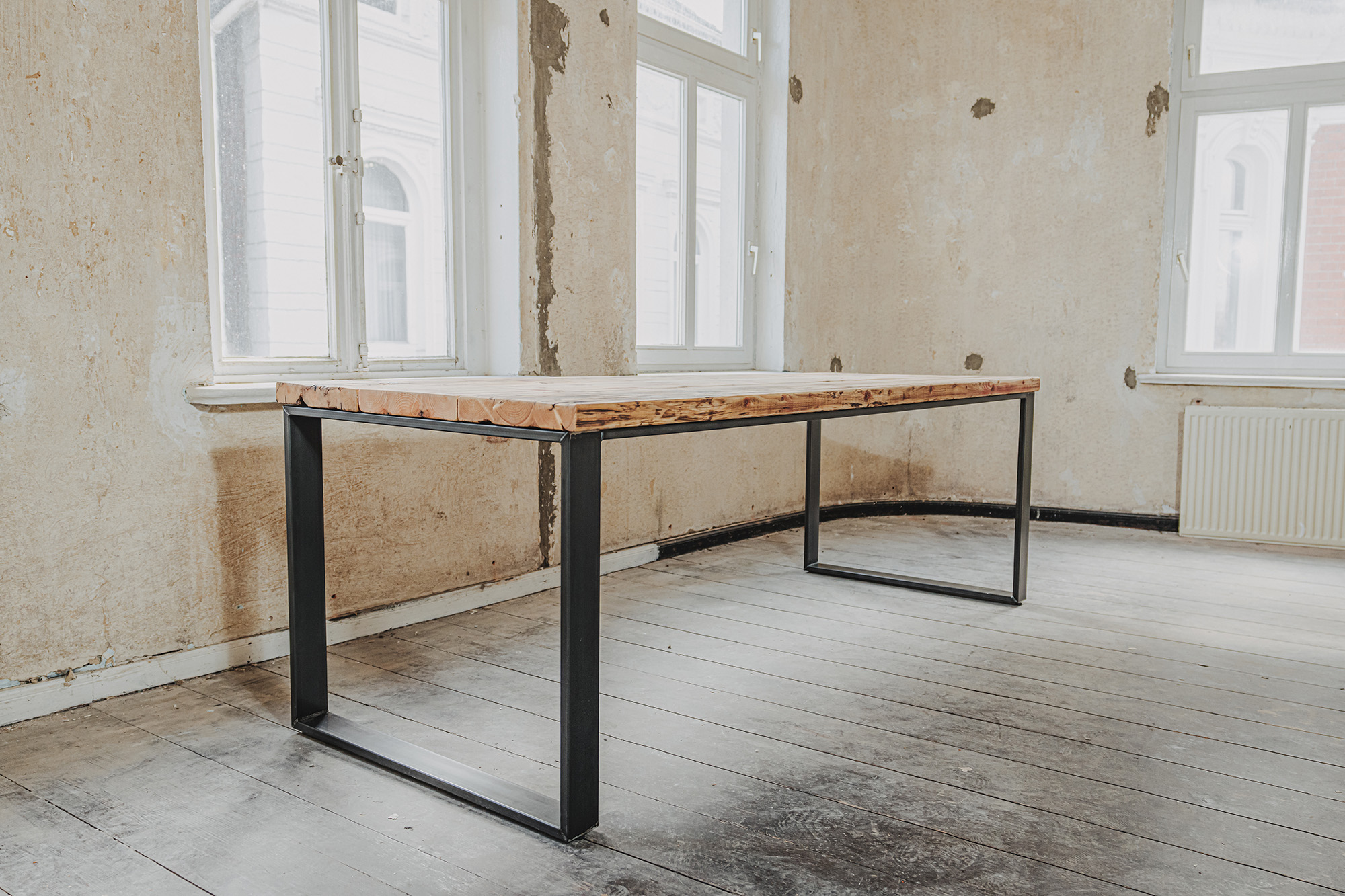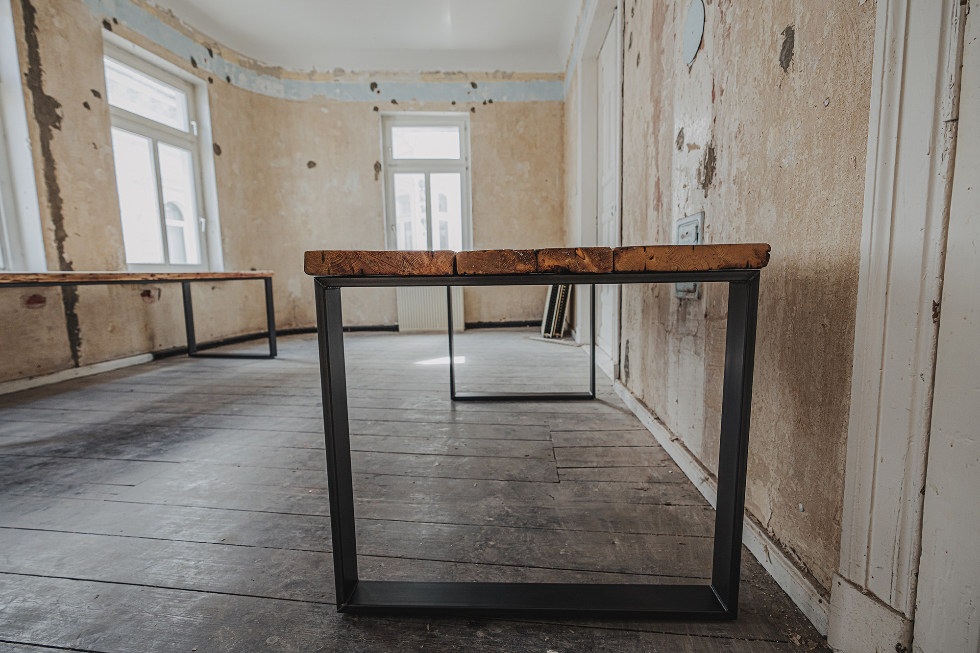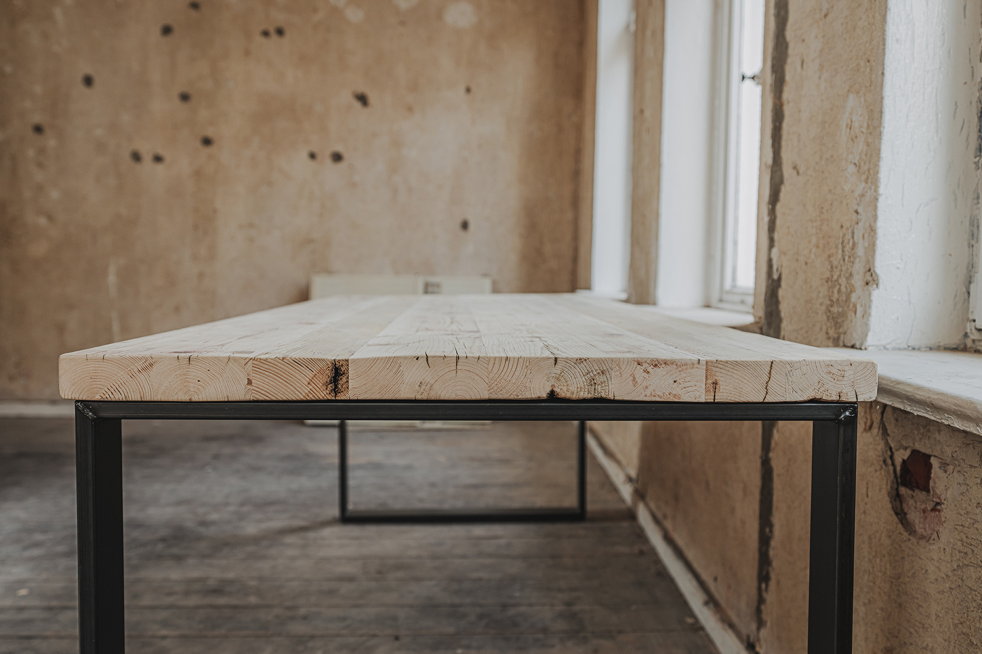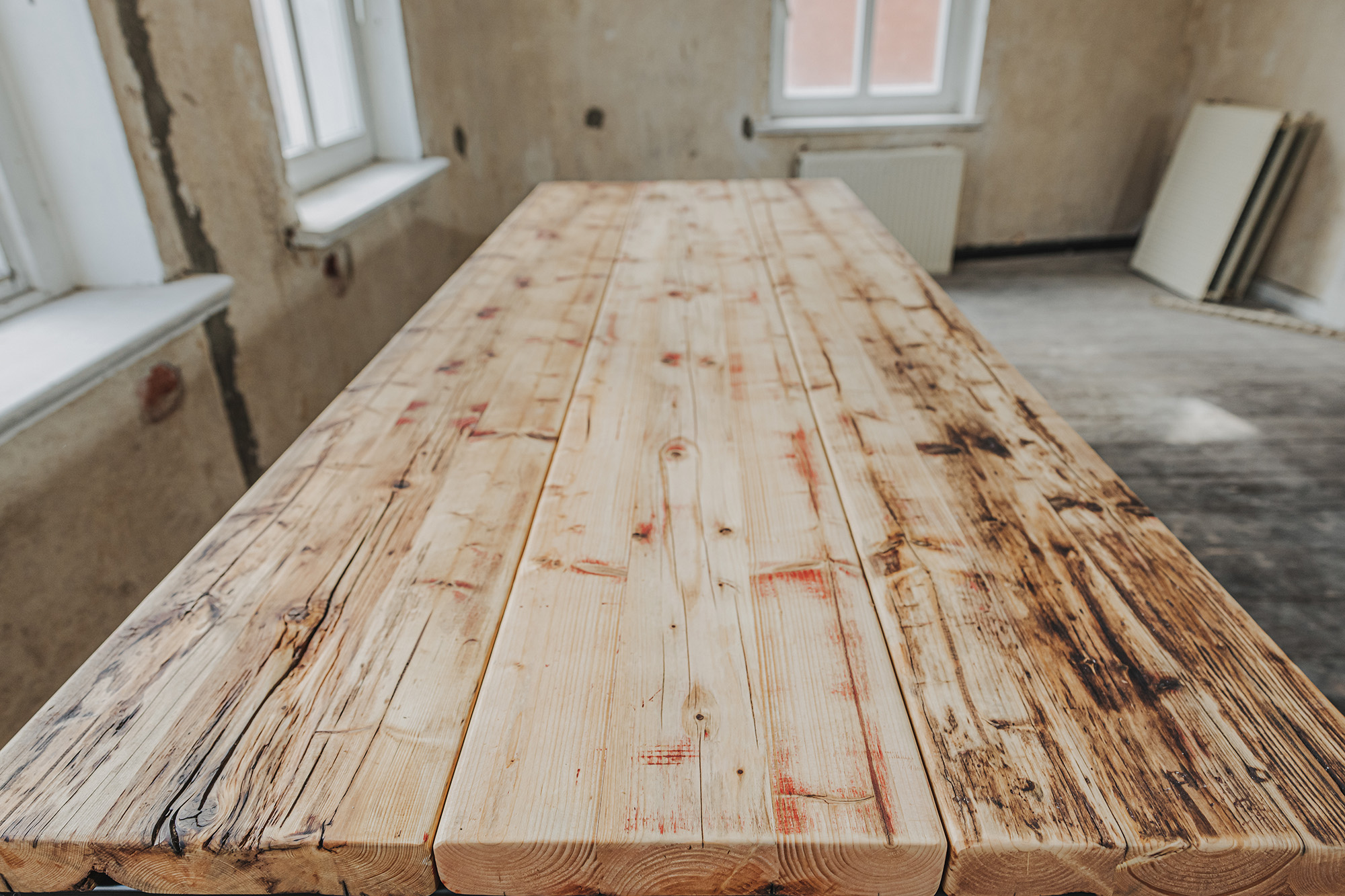 Die Möbel unserer Klassik-Serie werden aus recycelten Gerüstbohlen hergestellt, ohne Oberflächenschutz. Da es sich bei den Bohlen um Weichholz handelt, vornehmlich Fichte oder Tanne, reagieren sie auf Temperatur- und Feuchtigkeitsschwankungen. Dadurch können sich im Laufe der Zeit Maße und Oberflächen leicht verändern. Auch nach der Verarbeitung der Bohlen und der Herstellung der Möbel können Trocknungsrisse, Verwerfungen, Schwindungen oder Quellungen auftreten. Gelegentlich können sich Splitter, Äste oder ausgeschliffene Fehlstellen von der Oberfläche abheben oder lösen. Dies ist ein natürliches Verhalten von Holz und soll auch so sein. Unsere Möbel sollen lebendig bleiben.