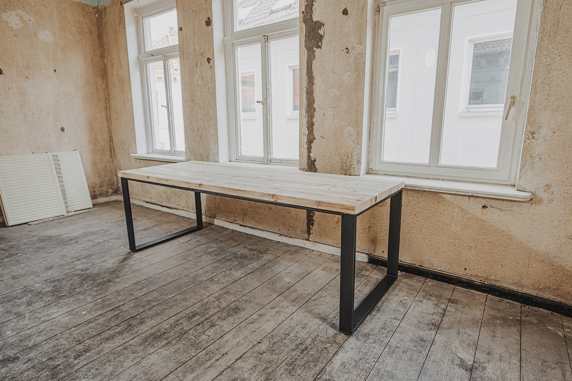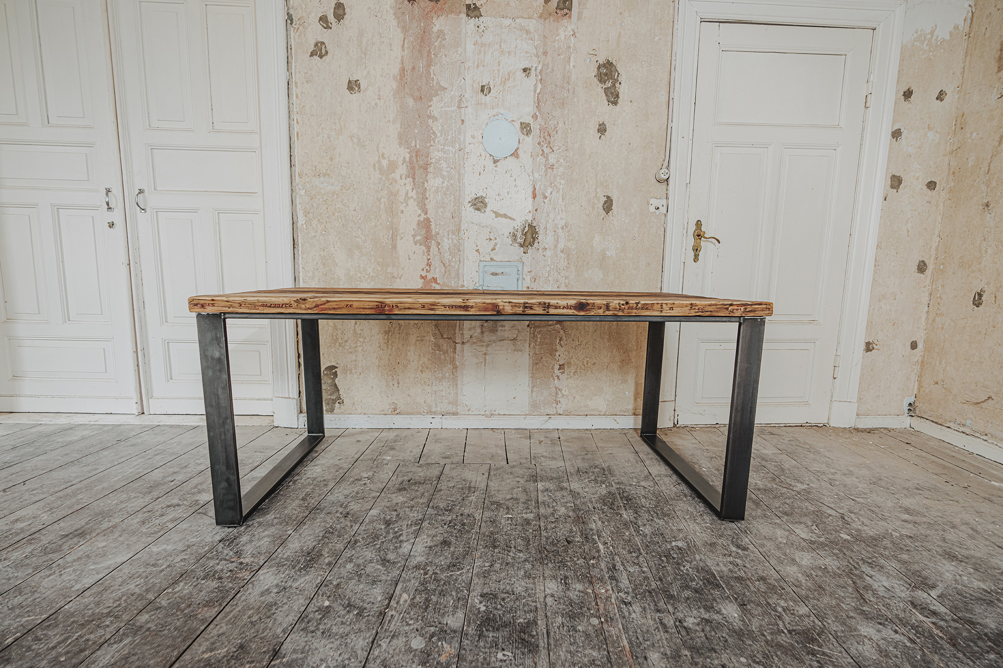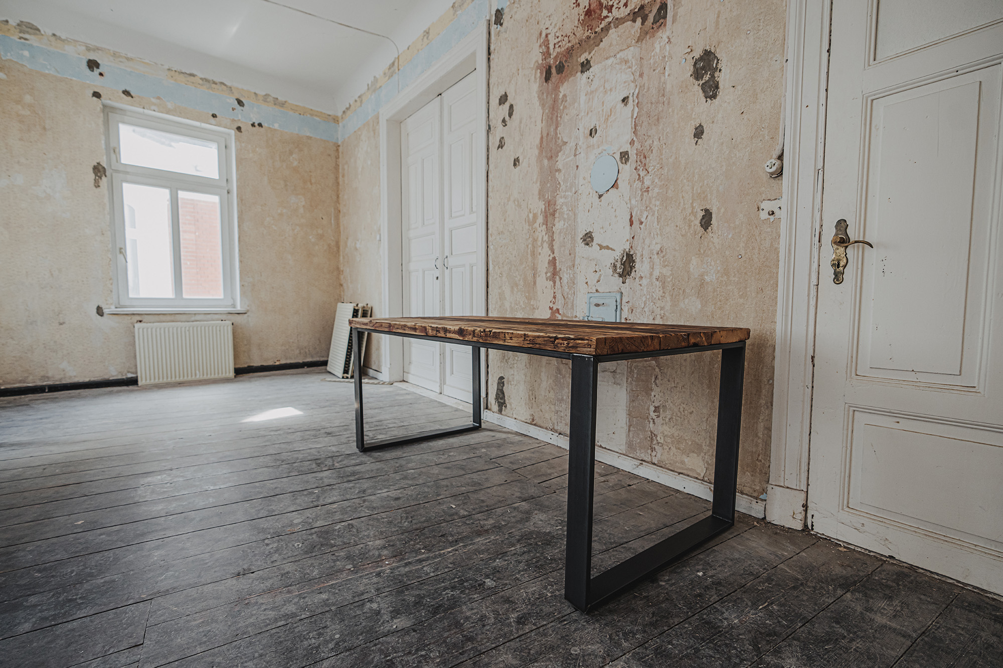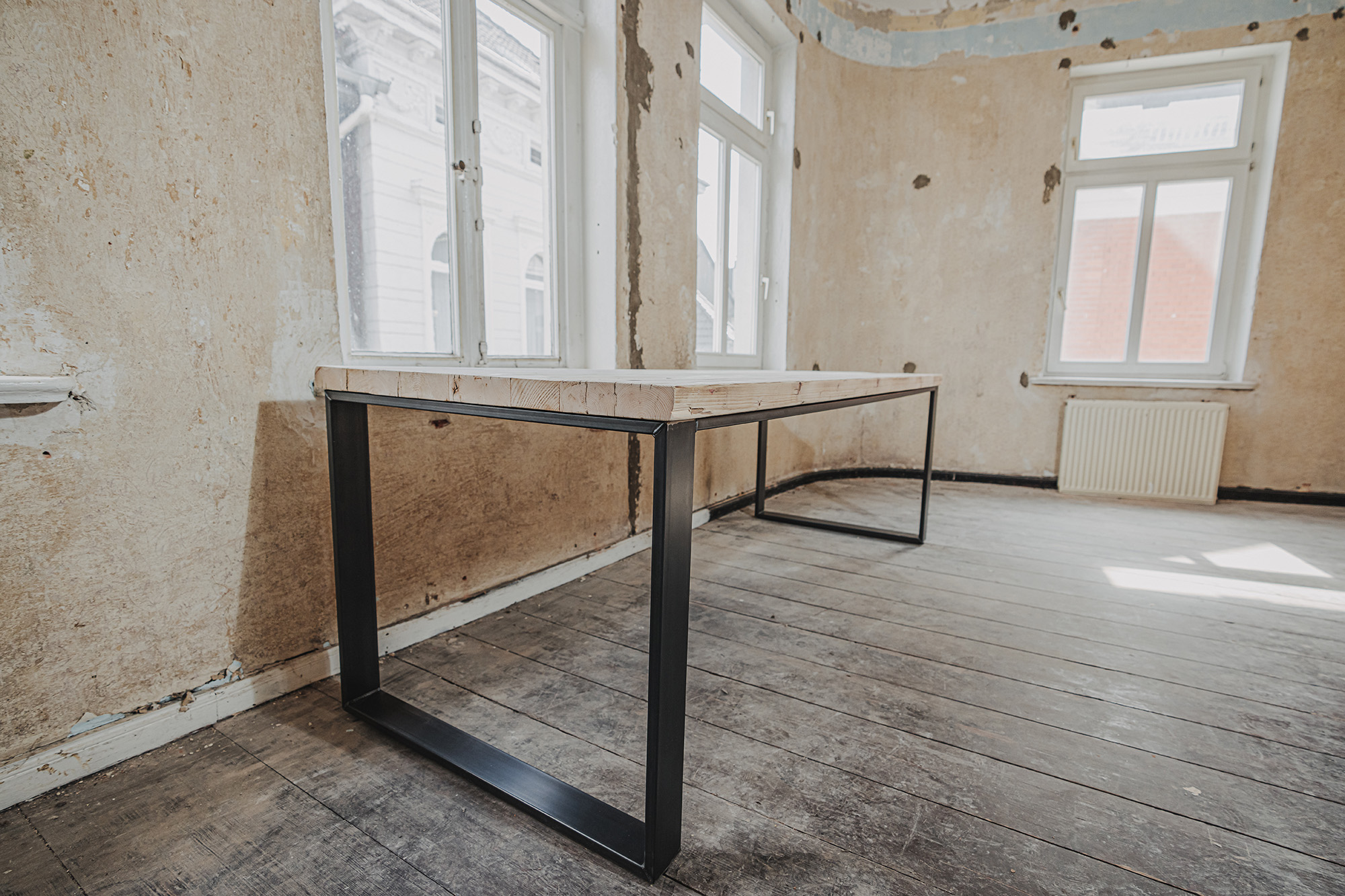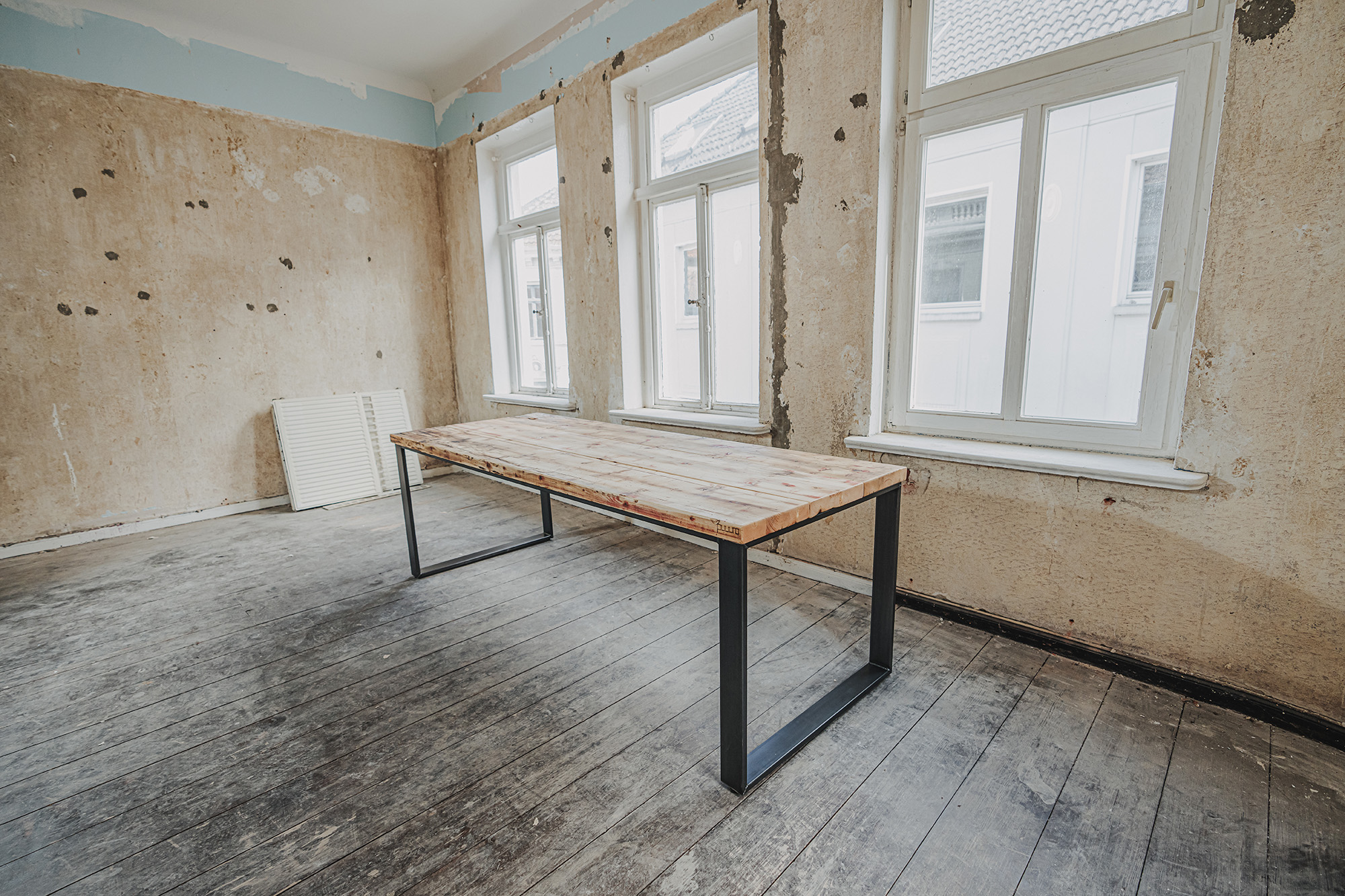 Die Möbel unserer Klassik-Serie werden aus recycelten Gerüstbohlen hergestellt, ohne Oberflächenschutz. Da es sich bei den Bohlen um Weichholz handelt, vornehmlich Fichte oder Tanne, reagieren sie auf Temperatur- und Feuchtigkeitsschwankungen. Dadurch können sich im Laufe der Zeit Maße und Oberflächen leicht verändern. Auch nach der Verarbeitung der Bohlen und der Herstellung der Möbel können Trocknungsrisse, Verwerfungen, Schwindungen oder Quellungen auftreten. Gelegentlich können sich Splitter, Äste oder ausgeschliffene Fehlstellen von der Oberfläche abheben oder lösen. Dies ist ein natürliches Verhalten von Holz und soll auch so sein. Unsere Möbel sollen lebendig bleiben.