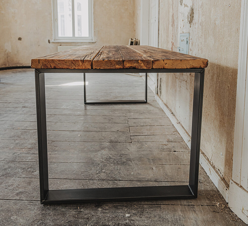Kufentisch Maru aus genutzten Bau-Gerüstbohlen  und Schwarzstahlgestell gem. Abbildungen.