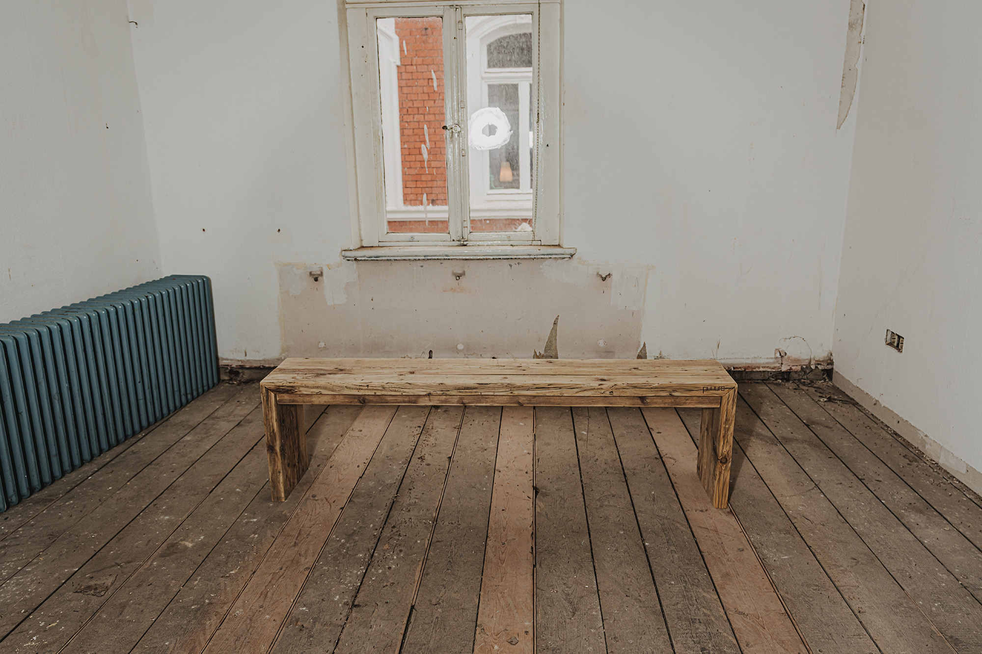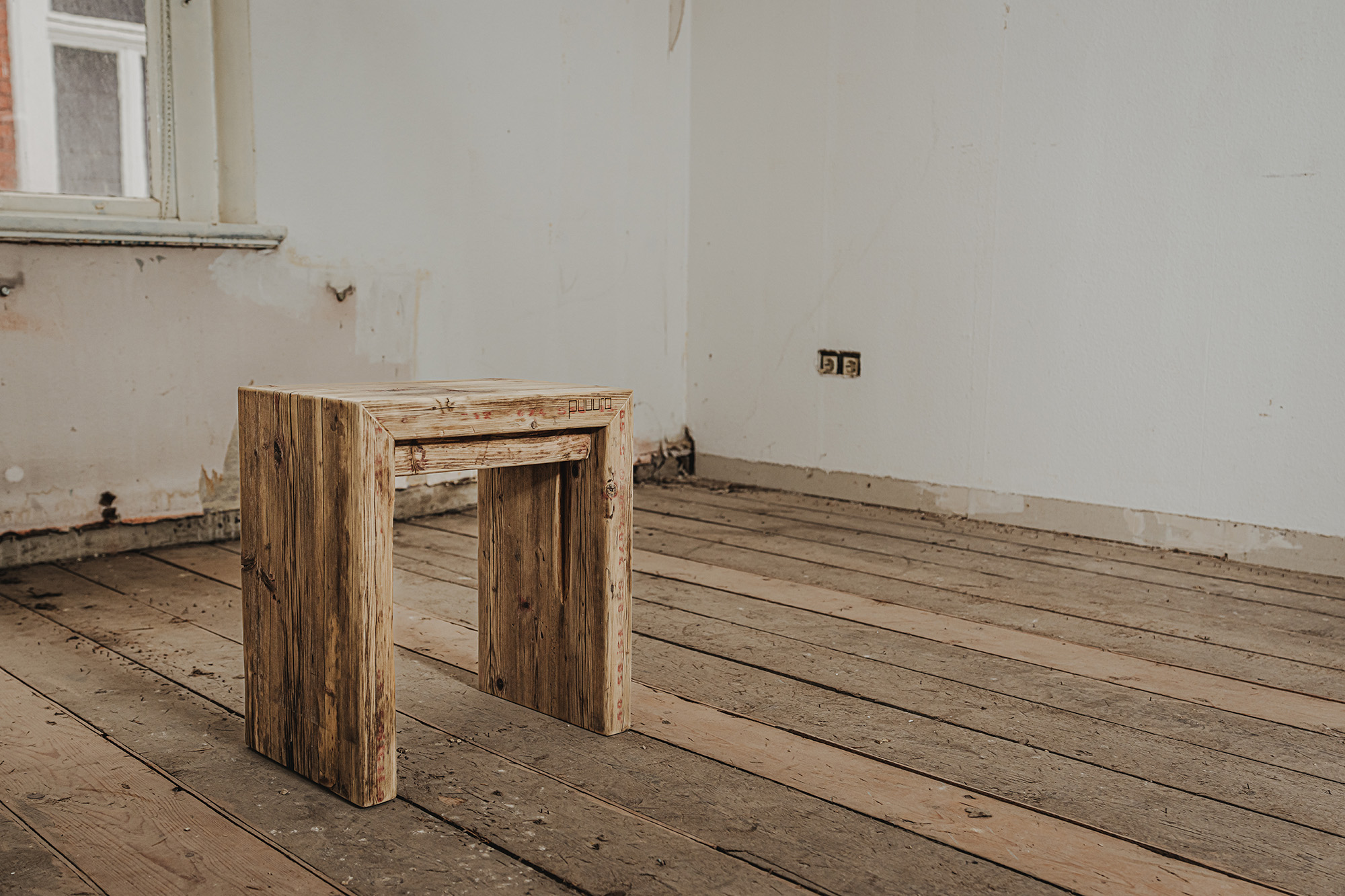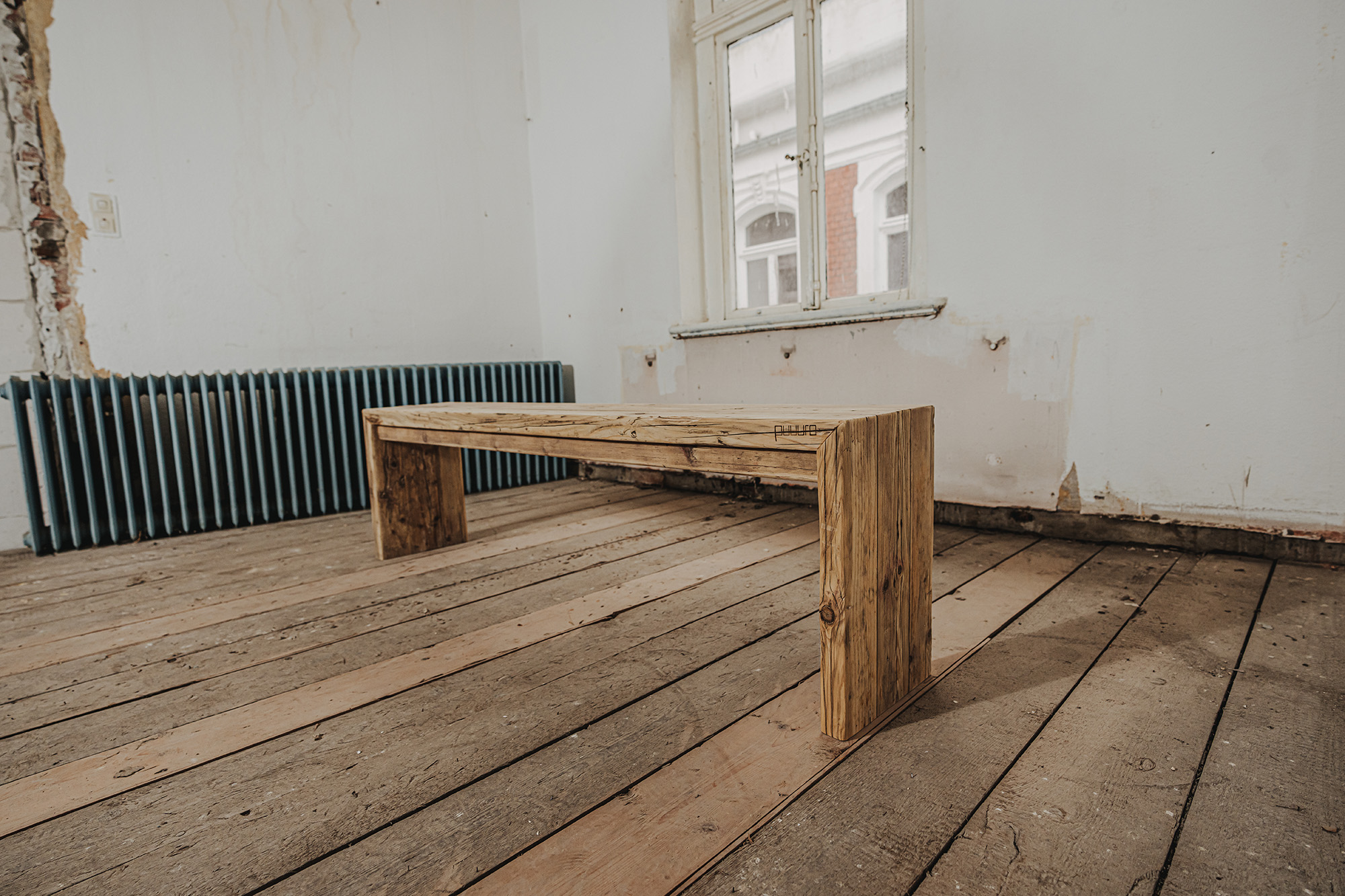 Die Möbel unserer Klassik-Serie werden aus recycelten Gerüstbohlen hergestellt, ohne Oberflächenschutz. Da es sich bei den Bohlen um Weichholz handelt, vornehmlich Fichte oder Tanne, reagieren sie auf Temperatur- und Feuchtigkeitsschwankungen. Dadurch können sich im Laufe der Zeit Maße und Oberflächen leicht verändern. Auch nach der Verarbeitung der Bohlen und der Herstellung der Möbel können Trocknungsrisse, Verwerfungen, Schwindungen oder Quellungen auftreten. Gelegentlich können sich Splitter, Äste oder ausgeschliffene Fehlstellen von der Oberfläche abheben oder lösen. Dies ist ein natürliches Verhalten von Holz und soll auch so sein. Unsere Möbel sollen lebendig bleiben.