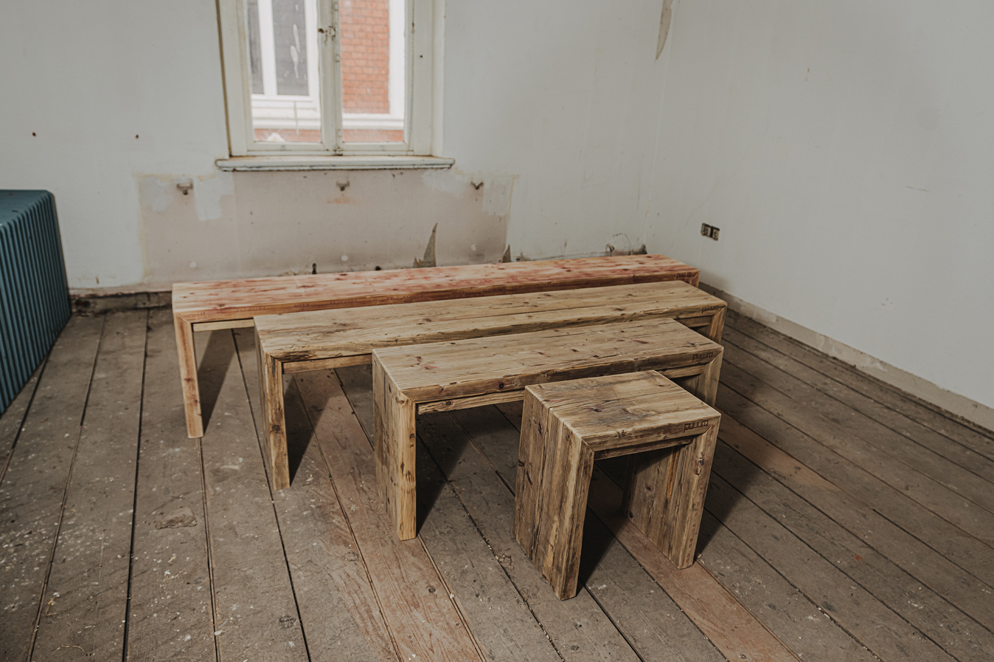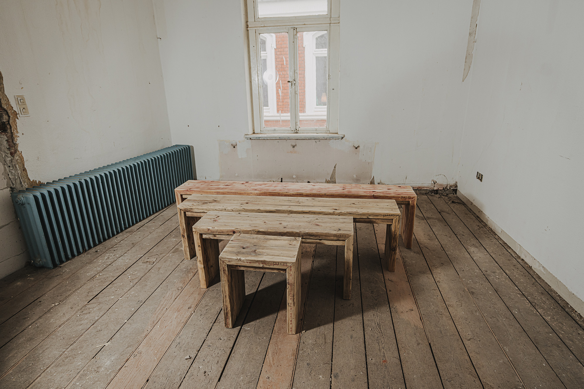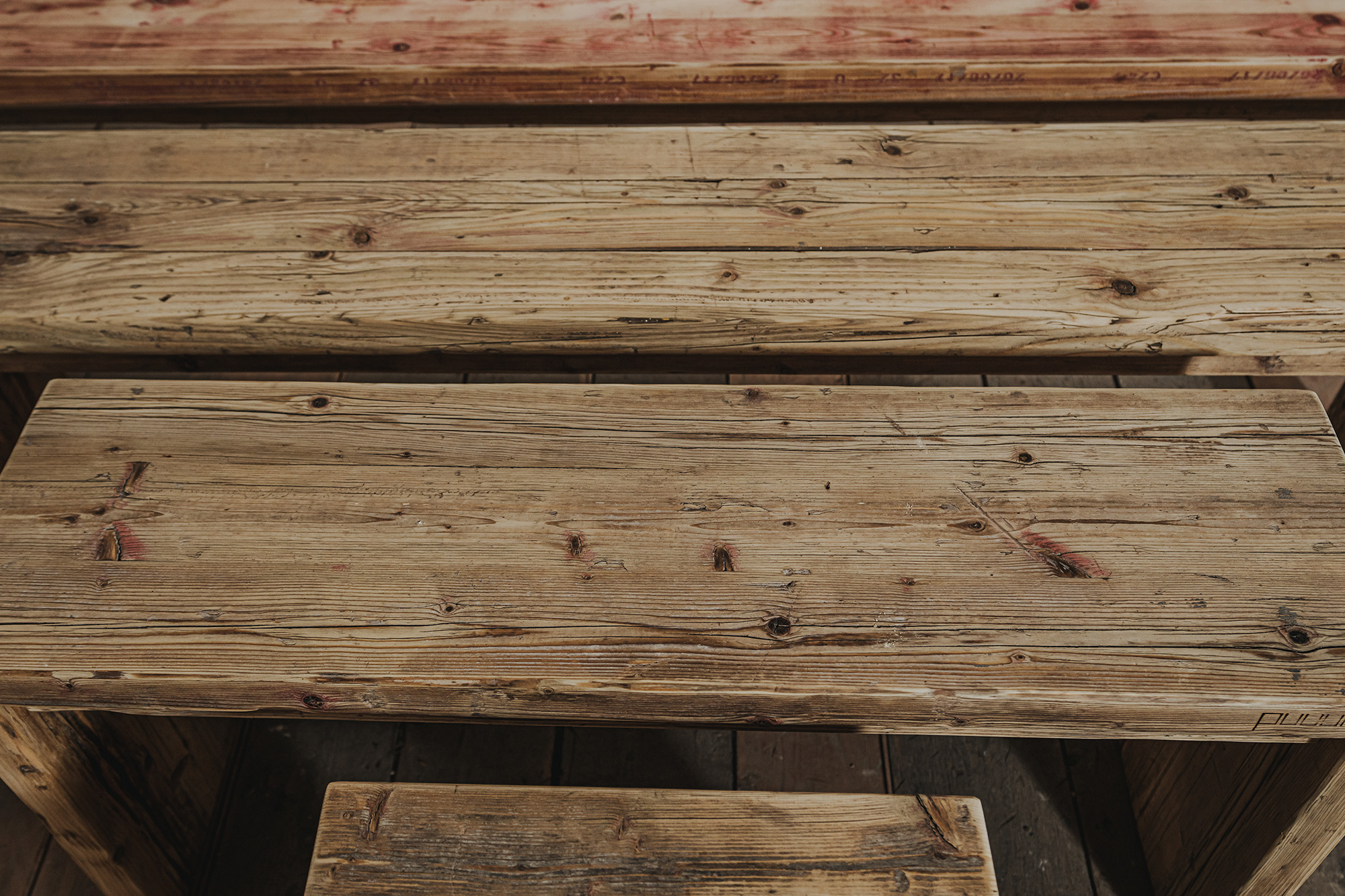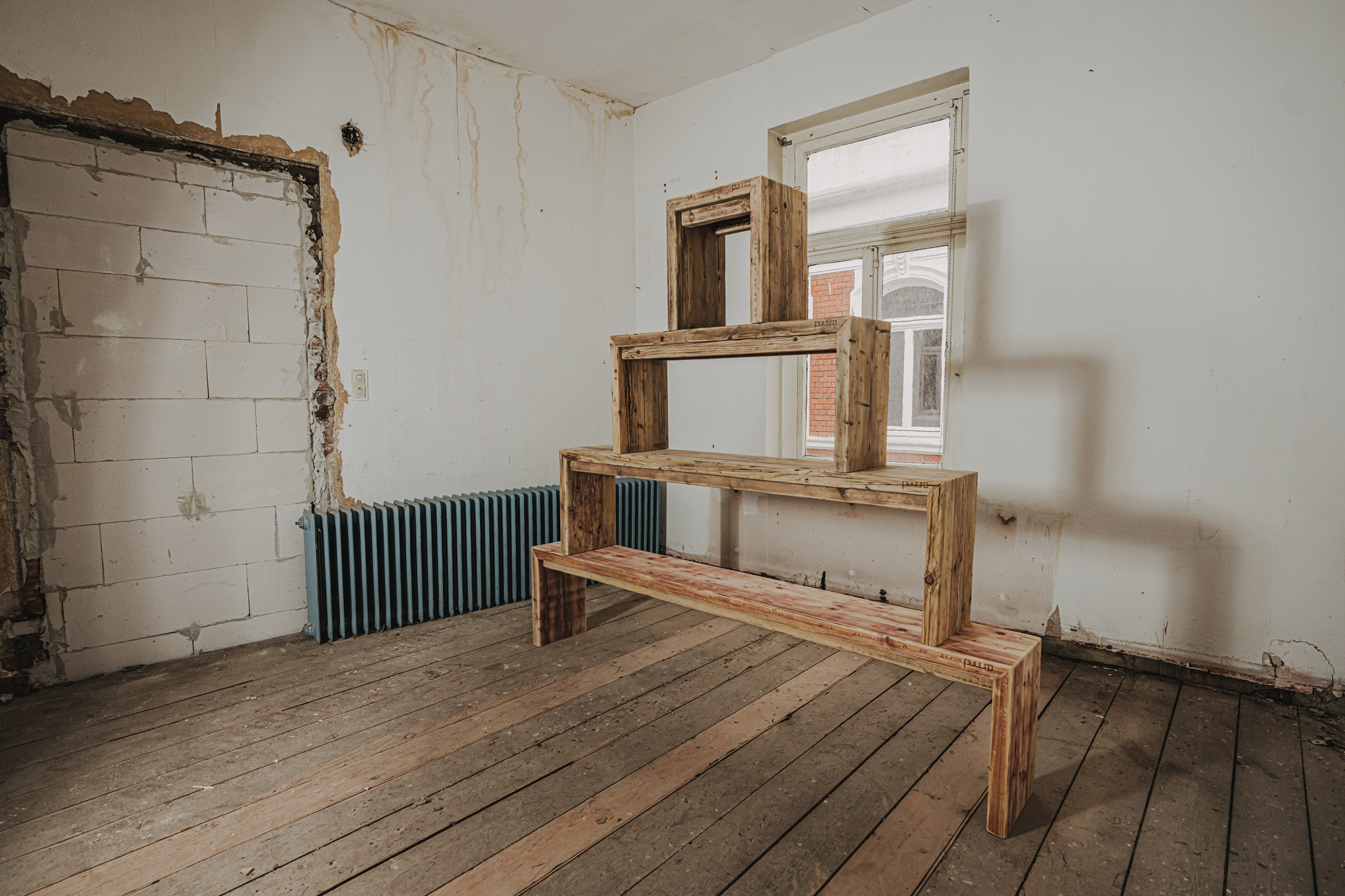 Die Möbel unserer Klassik-Serie werden aus recycelten Gerüstbohlen hergestellt, ohne Oberflächenschutz. Da es sich bei den Bohlen um Weichholz handelt, vornehmlich Fichte oder Tanne, reagieren sie auf Temperatur- und Feuchtigkeitsschwankungen. Dadurch können sich im Laufe der Zeit Maße und Oberflächen leicht verändern. Auch nach der Verarbeitung der Bohlen und der Herstellung der Möbel können Trocknungsrisse, Verwerfungen, Schwindungen oder Quellungen auftreten. Gelegentlich können sich Splitter, Äste oder ausgeschliffene Fehlstellen von der Oberfläche abheben oder lösen. Dies ist ein natürliches Verhalten von Holz und soll auch so sein. Unsere Möbel sollen lebendig bleiben.